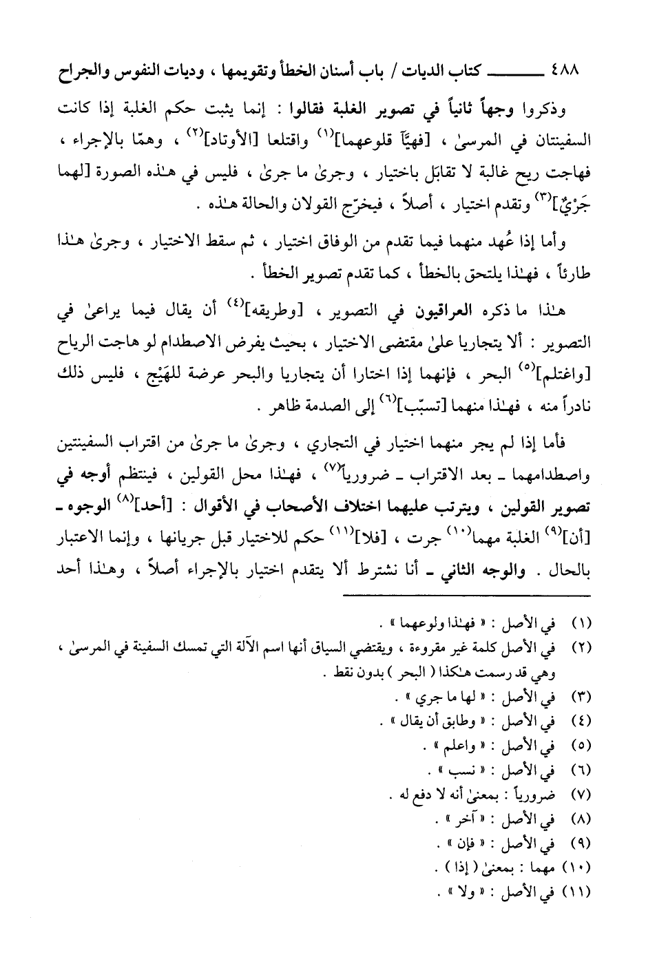 فأما إذا لم يجر منهما اختيار في التجاري، وجرى ما جرى من اقتراب السفينتين واصطدامهما -بعد الاقتراب- ضرورياً (7)، فهذا محل القولين، فينتظم أوجه في تصوير القولين، ويترتب عليهما اختلاف الأصحاب في الأقوال: [أحد] (8) الوجوه-[أن] (9) الغلبة مهما (10) جرت، [فلا] (11) حكم للاختيار قبل جريانها، وإنما الاعتبار بالحال. والوجه الثاني - أنا نشترط ألا يتقدم اختيار بالإجراء أصلاً، وهذا أحد