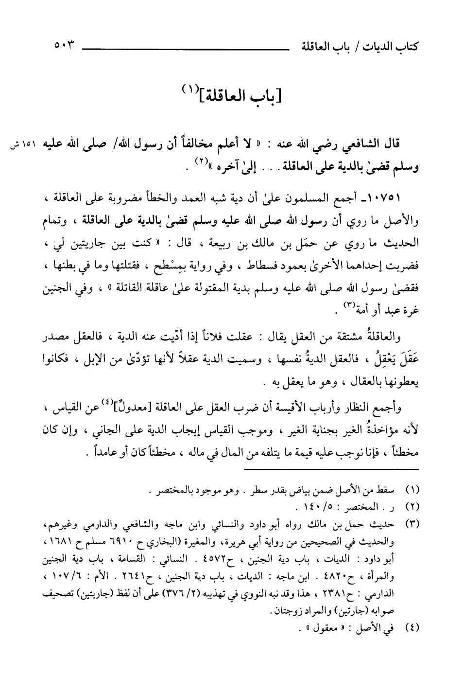 قال الشافعي رضي الله عنه: "لا أعلم مخالفاً أن رسول الله صلى الله عليه وسلم قضى بالدية على العاقلة ... إلى آخره" (2).