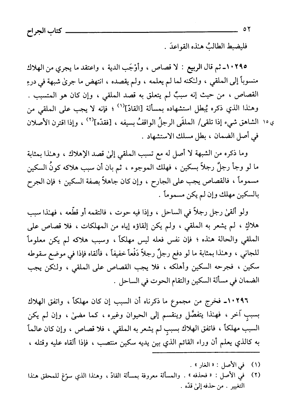 10296 - فخرج من مجموع ما ذكرناه أن السبب إن كان مهلكاً، واتفق الهلاك بسببٍ آخر، فهذا يتفصَّل وينقسم إلى الحيوان وغيره، كما مضى، وإن لم يكن السبب مهلكاً، فاتفق الهلاك بسببٍ لم يشعر به الملقي، فلا قصاص، وإن كان عالماً به كالذي يعلم أن وراء القائم الذي بين يديه سكين منتصب، فإذا ألقاه عليه وقتله،