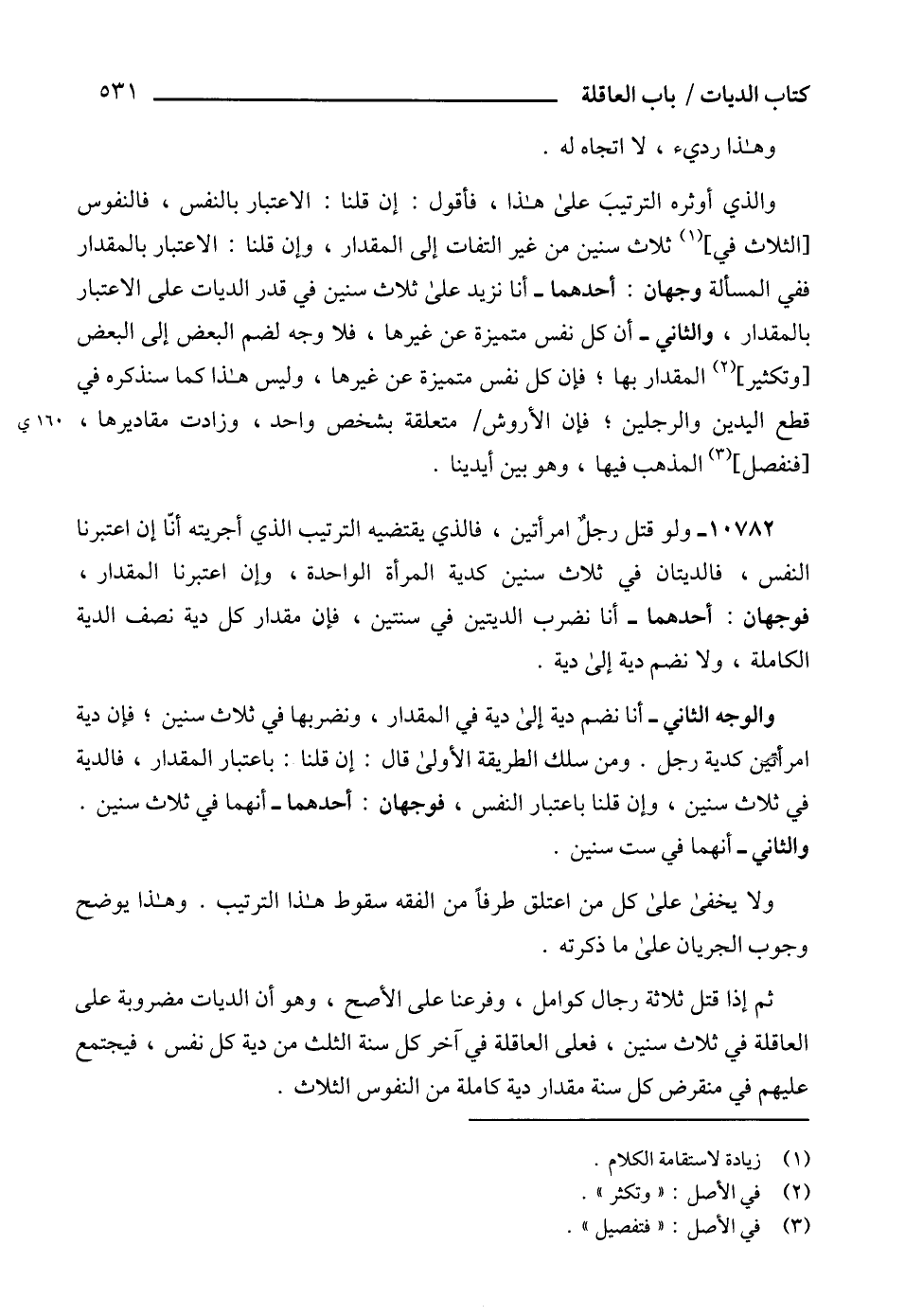 والذي أوثره الترتيبَ على هذا، فأقول: إن قلنا: الاعتبار بالنفس، فالنفوس [الثلاث في] (1) ثلاث سنين من غير التفات إلى المقدار، وإن قلنا: الاعتبار بالمقدار ففي المسألة وجهان: أحدهما - أنا نزيد على ثلاث سنين في قدر الديات على الاعتبار بالمقدار، والثاني - أن كل نفس متميزة عن غيرها، فلا وجه لضم البعض إلى البعض [وتكثير] (2) المقدار بها؛ فإن كل نفس متميزة عن غيرها، وليس هذا كما سنذكره في قطع اليدين والرجلين؛ فإن الأروش متعلقة بشخص واحد، وزادت مقاديرها، [فنفصل] (3) المذهب فيها، وهو بين أيدينا.