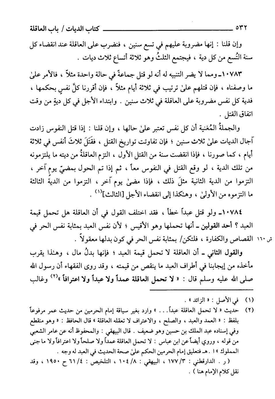 (2) حديث "لا تحمل العاقلة عبداً ... " وارد بغير سياقة إمام الحرمين من حديث عمر مرفوعاً بلفظ: "العمد والعبد، والصلح، والاعتراف لا تعقله العاقلة" قال الحافظ: (وهو منقطع وفي إسناده عبد الملك بن حسين وهو ضعيف. قال البيهقي: والمحفوظ أنه عن عامر الشعبي من قوله، وروي أيضاً عن ابن عباس: لا تحمل العاقلة عمداً ولا صلحاً ولا اعترافاً ولا ما جنى المملوك" ا. هـ فتعليق إمام الحرمين الحكم على صحة الحديث في العبد له وجه.