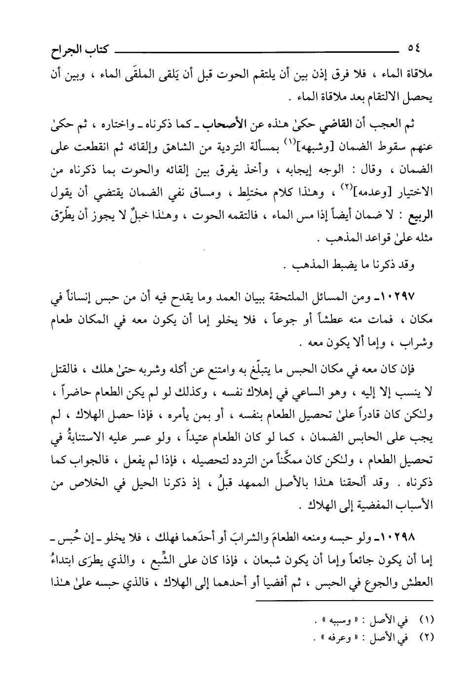 10297 - ومن المسائل الملتحقة ببيان العمد وما يقدح فيه أن من حبس إنساناً في مكان، فمات منه عطشاَّ أَو جوعاً، فلا يخلو إما أن يكون معه في المكان طعام وشراب، وإما ألا يكون معه.