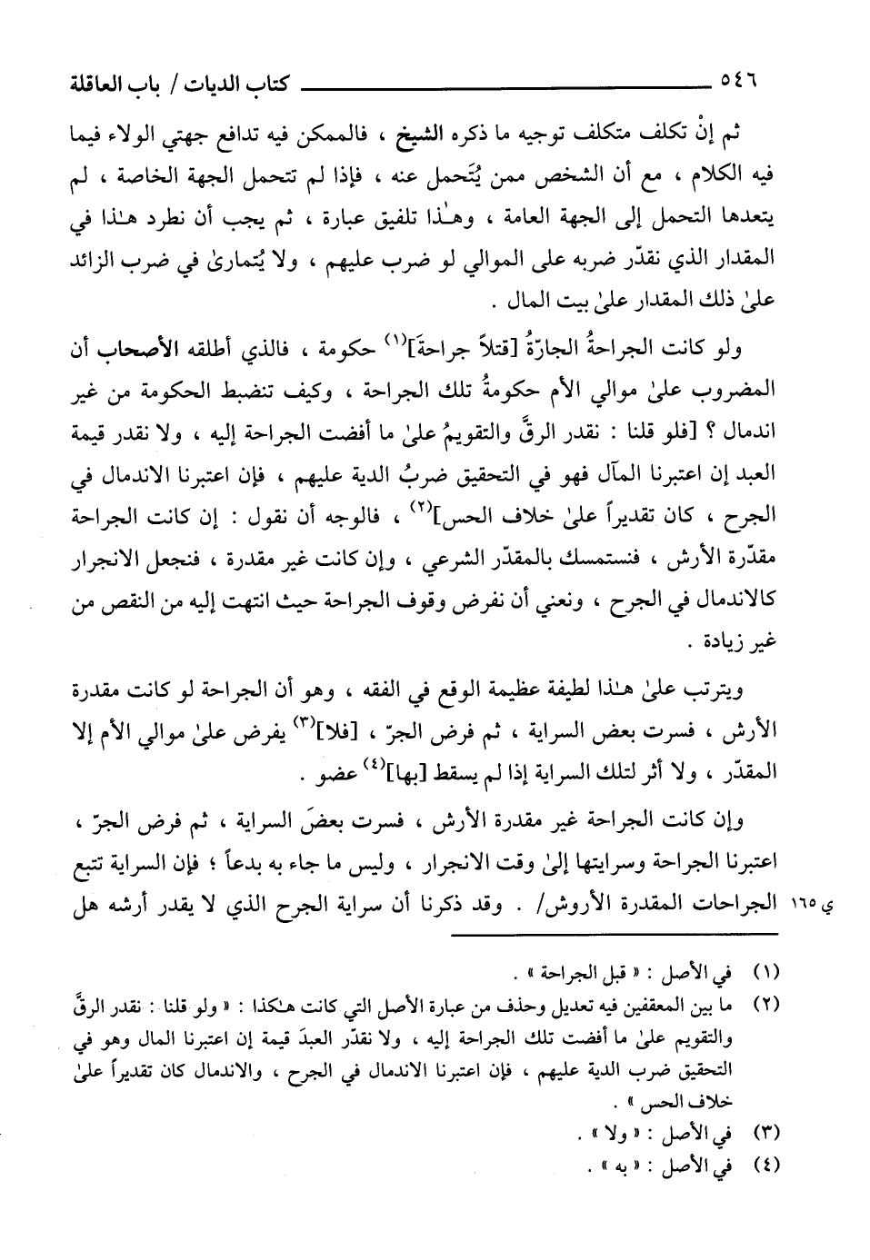 (2) ما بين المعقفين فيه تعديل وحذف من عبارة الأصل التي كانت هكذا: "ولو قلنا: نقدر الرقَّ والتقويم على ما أفضت تلك الجراحة إليه، ولا نقدّر العبدَ قيمة إن اعتبرنا المال وهو في التحقيق ضرب الدية عليهم، فإن اعتبرنا الاندمال في الجرح، والاندمال كان تقديراً على خلاف الحس".