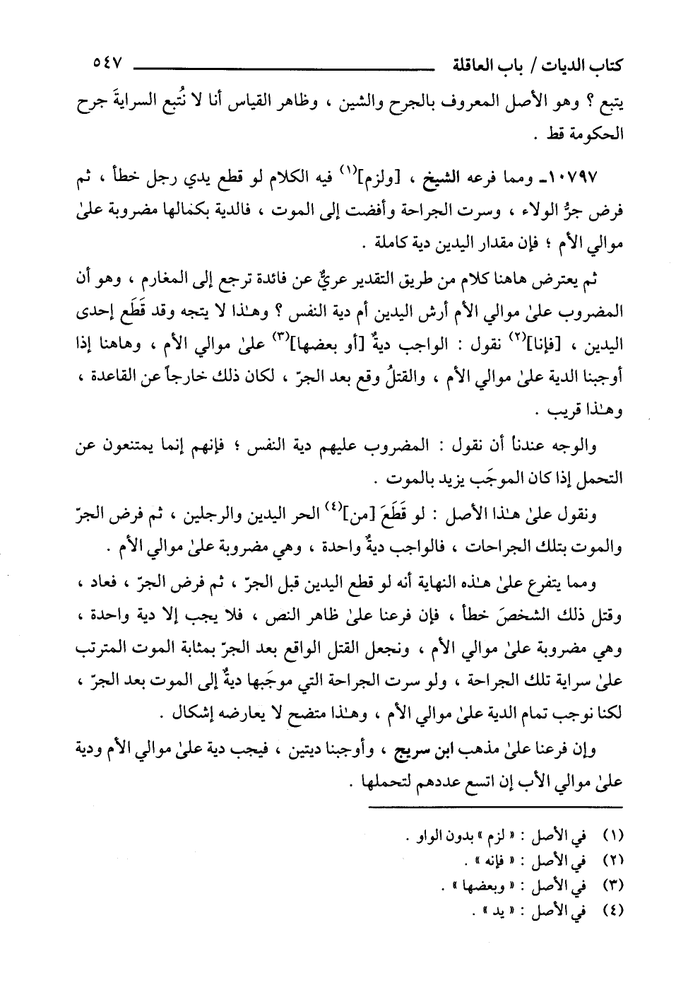 10797 - ومما فرعه الشيخ، [ولزم] (1) فيه الكلام لو قطع يدي رجل خطأ، ثم فرض جرُّ الولاء، وسرت الجراحة وأفضت إلى الموت، فالدية بكقالها مضروبة على موالي الأم؛ فإن مقدار اليدين دية كاملة.