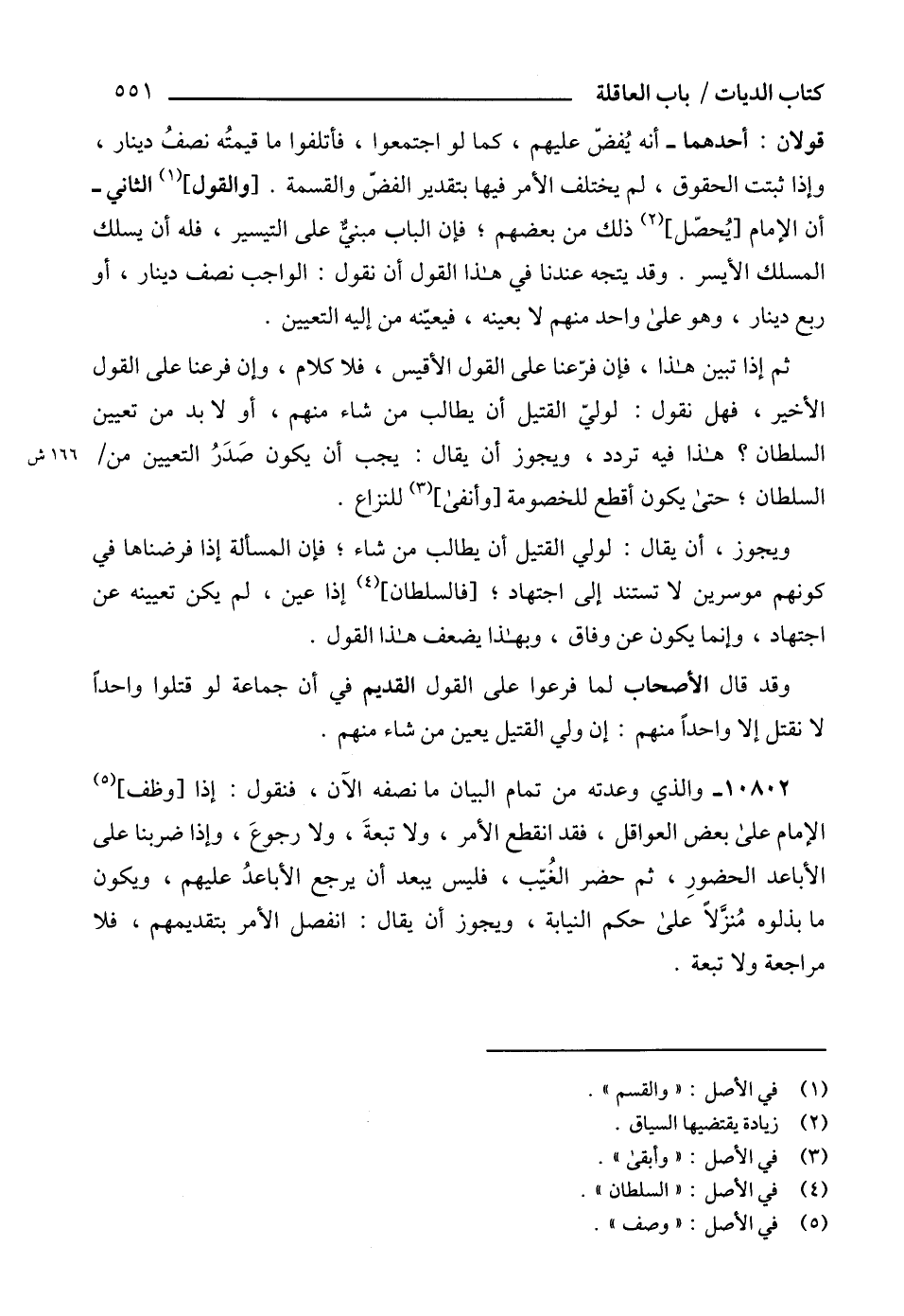 10802 - والذي وعدته من تمام البيان ما نصفه الآن، فنقول: إذا [وظف] (5) الإمام على بعض العواقل، فقد انقطع الأمر، ولا تبعةَ، ولا رجوعَ، وإذا ضربنا على الأباعد الحضورِ، ثم حضر الغُيّب، فليس يبعد أن يرجع الأباعدُ عليهم، ويكون ما بذلوه مُنزَّلاً على حكم النيابة، ويجوز أن يقال: انفصل الأمر بتقديمهم، فلا مراجعة ولا تبعة.