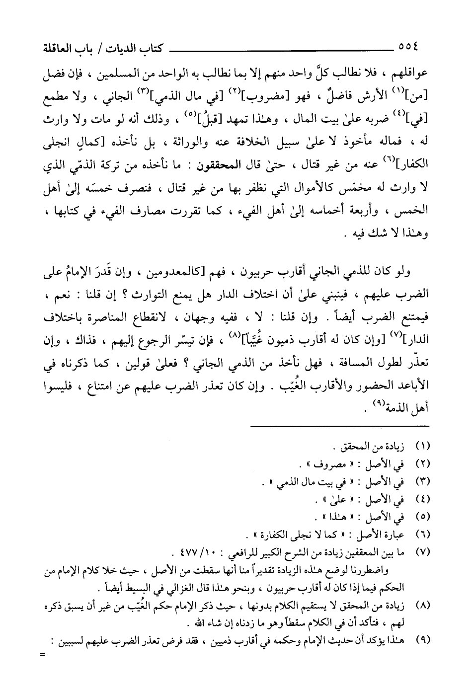 واضطررنا لوضع هذه الزيادة تقديراً منا أنها سقطت من الأصل، حيث خلا كلام الإمام من الحكم فيما إذا كان له أقارب حربيون، وبنحو هذا قال الغزالي في البسيط أيضاًً.