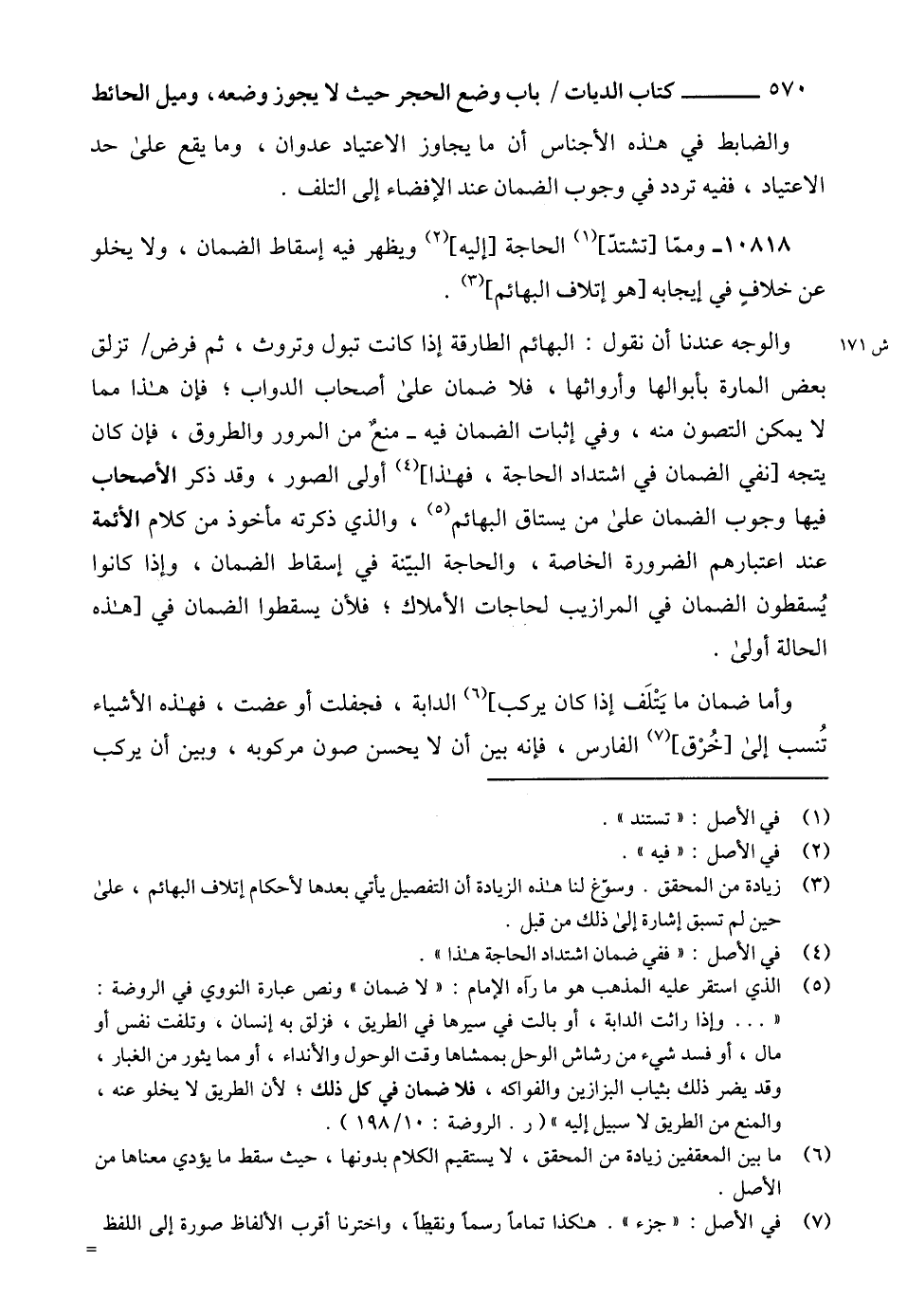 (3) زيادة من المحقق. وسوّغ لنا هذه الزيادة أن التفصيل يأتي بعدها لأحكام إتلاف البهائم، على حين لم تسبق إشارة إلى ذلك من قبل.