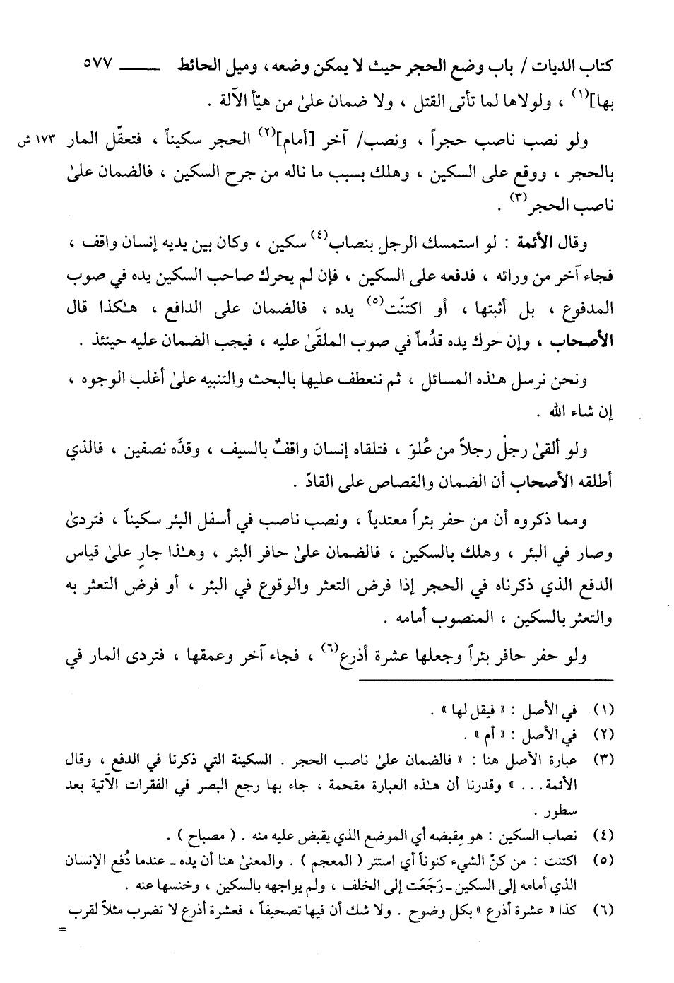 (3) عبارة الأصل هنا: "فالضمان على ناصب الحجر. السكينة التي ذكرنا في الدفع، وقال الأئمة ... " وقدرنا أن هذه العبارة مقحمة، جاء بها رجع البصر في الفقرات الآتية بعد سطور.