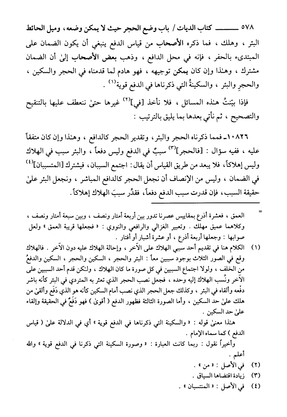 (1) الكلام هنا في تقديم أحد سببي الهلاك على الآخر، وإحالة الهلاك عليه دون الآخر. فالهلاك وقع في الصور الثلاث بوجود سببين معاً: البئر والحجر، السكين والحجر، السكين والدفعُ من الخلف، ولولا اجتماع السببين في كل صورة ما كان الهلاك، ولكن قدم أحد السببين على الآخر ونُسب الهلاك إليه وحده، فجعل نصب الحجر الذي تعثر به المتردي في البئر كأنه باشر دفْعه وألقاه في البئر، وكذلك جعل الحجر الذي نصب أمام السكين كانه هوِ الذي دَفَع وألقى من هلك على حد السكين، وأما الصورة الثالثة فظهور الدفع (أقوى) فهو دَفعٌ في الحقيقة وإلقاء على حد السكين.