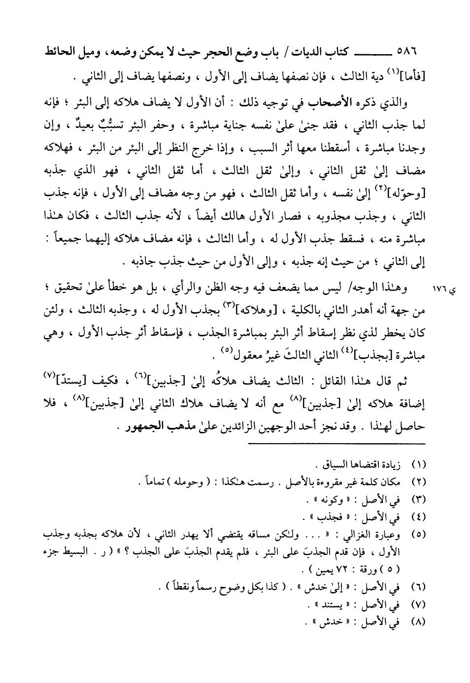 (5) وعبارة الغزالي: " ... ولكن مساقه يقتضي ألا يهدر الثاني، لأن هلاكه بجذبه وجذب الأول، فإن قدم الجذبَ على البئر، فلم يقدم الجذبَ على الجذب؟ " (ر. البسيط جزء (5) ورقة: 72 يمين).