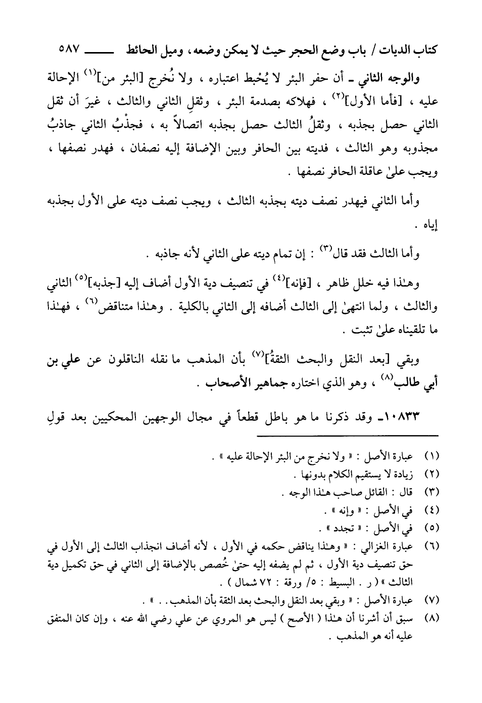(6) عبارة الغزالي: "وهذا يناقض حكمه في الأول، لأنه أضاف انجذاب الثالث إلى الأول في حق تنصيف دية الأول، ثم لم يضفه إليه حتى خُصص بالإضافة إلى الثاني في حق تكميل دية الثالث " (ر. البسيط: 5/ورقة: 72 شمال).