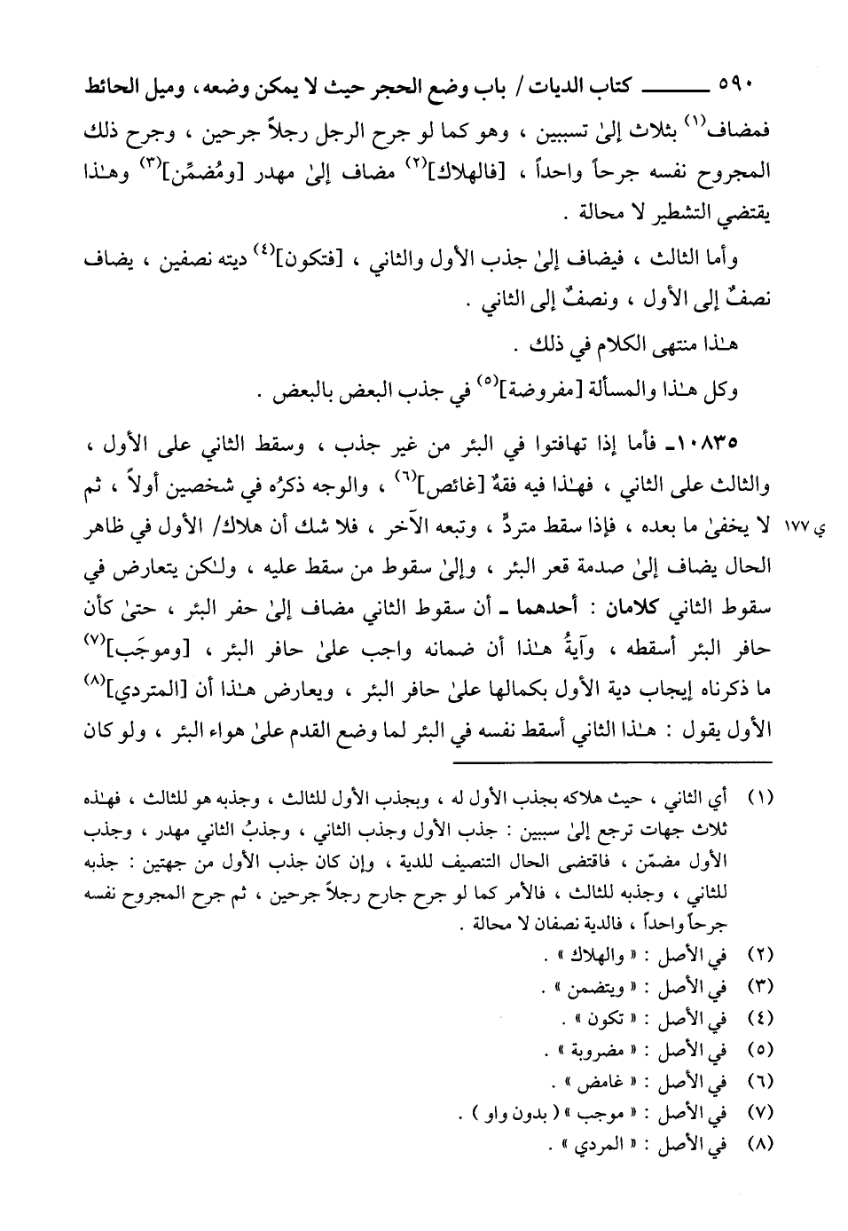 10835 - فأما إذا تهافتوا في البئر من غير جذب، وسقط الثاني على الأول، والثالث على الثاني، فهذا فيه فقهٌ [غائص] (6)، والوجه ذكرُه في شخصين أولاً، ثم لا يخفى ما بعده، فإذا سقط متردٍّ، وتبعه الآخر، فلا شك أن هلاك الأول في ظاهر الحال يضاف إلى صدمة قعر البئر، وإلى سقوط من سقط عليه، ولكن يتعارض في سقوط الثاني كلامان: أحدهما - أن سقوط الثاني مضاف إلى حفر البئر، حتى كأن حافر البئر أسقطه، وآيةُ هذا أن ضمانه واجب على حافر البئر، [وموجَب] (7) ما ذكرناه إيجاب دية الأول بكمالها على حافر البئر، ويعارض هذا أن [المتردي] (8) الأول يقول: هذا الثاني أسقط نفسه في البئر لما وضع القدم على هواء البئر، ولو كان