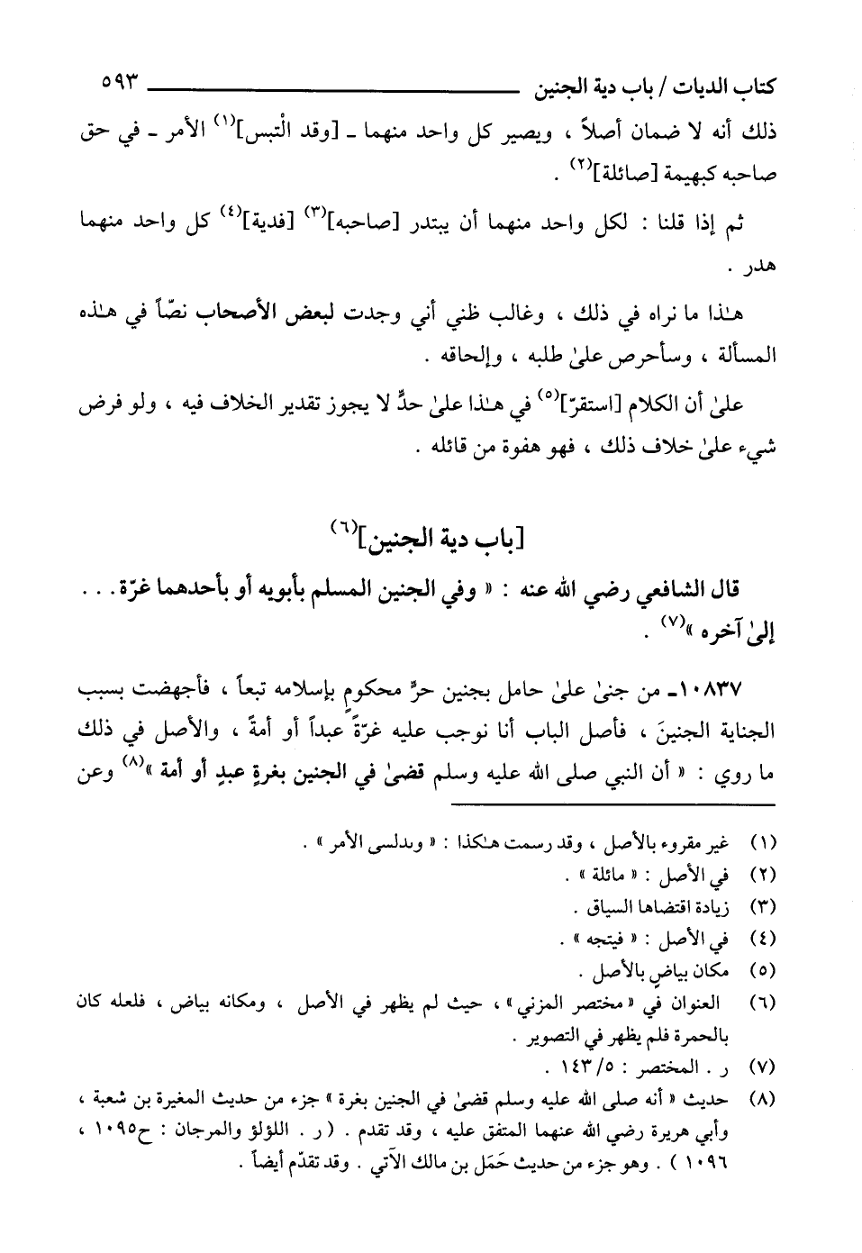 10837 - من جنى على حامل بجنين حرٍّ محكومٍ بإسلامه تبعاً، فأجهضت بسبب الجناية الجنينَ، فأصل الباب أنا نوجب عليه غرّةً عبداً أو أمةً، والأصل في ذلك ما روي: "أن النبي صلى الله عليه وسلم قضى في الجنين بغرةٍ عبدٍ أو أمة" (8) وعن