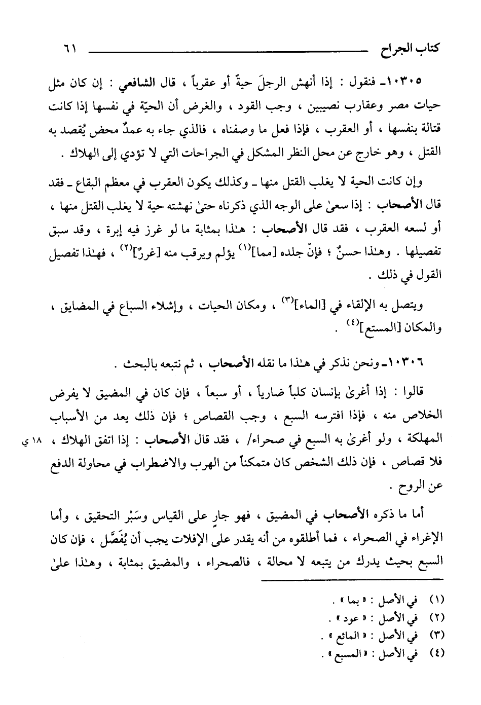 10305 - فنقول: إذا أنهش الرجلَ حيةً أو عقرباً، قال الشافعي: إن كان مثل حيات مصر وعقارب نصيبين، وجب القود، والغرض أن الحيّة في نفسها إذا كانت قتالة بنفسها، أو العقرب، فإذا فعل ما وصفناه، فالذي جاء به عمدٌ محض يُقصد به القتل، وهو خارج عن محل النظر المشكل في الجراحات التي لا تؤدي إلى الهلاك.
