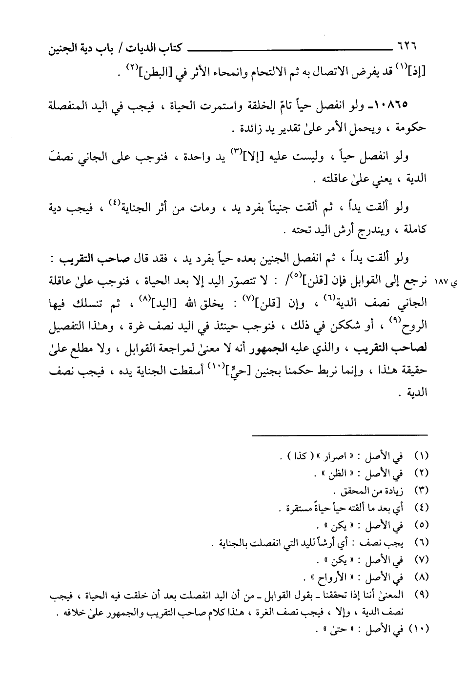 (9) المعخى أننا إذا تحققنا -بقول القوابل- من أن اليد انفصلت بعد أن خلقت فيه الحياة، فيجب نصف الدية، وإلا، فيجب نصف الغرة، هذا كلام صاحب التقريب والجمهور على خلافه.