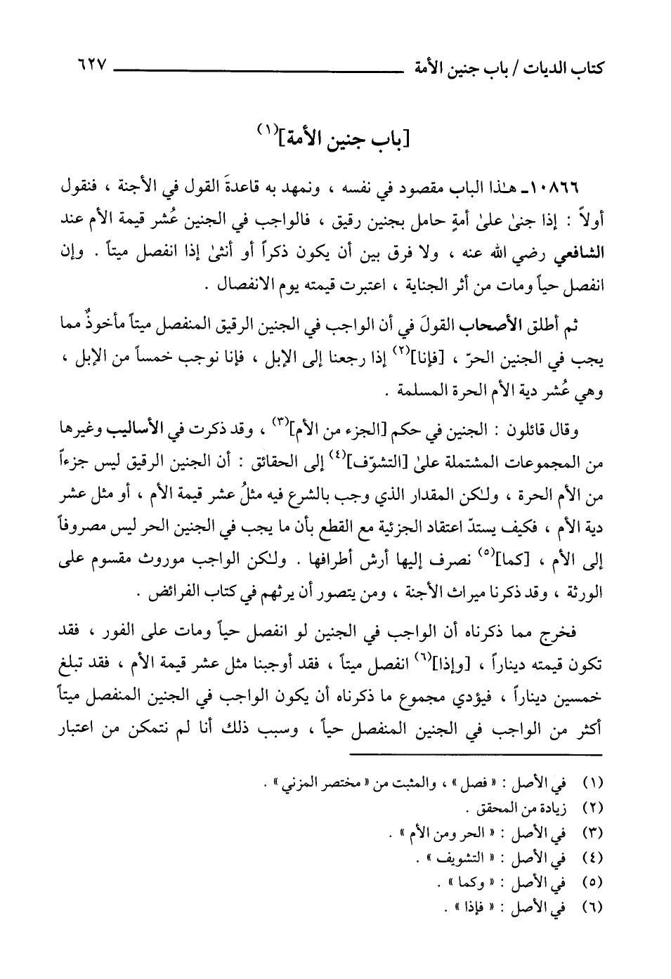 وقال قائلون: الجنين في حكم [الجزء من الأم] (3)، وقد ذكرت في الأساليب وغيرها من المجموعات المشتملة على [التشوّف] (4) إلى الحقائق: أن الجنين الرقيق ليس جزءاً من الأم الحرة، ولكن المقدار الذي وجب بالشرع فيه مثلُ عشر قيمة الأم، أو مثل عشر دية الأم، فكيف يستدّ اعتقاد الجزئية مع القطع بأن ما يجب في الجنين الحر ليس مصروفاً إلى الأم، [كما] (5) نصرف إليها أرش أطرافها. ولكن الواجب موروث مقسوم على الورثة، وقد ذكرنا ميراث الأجنة، ومن يتصور أن يرثهم في كتاب الفرائض.