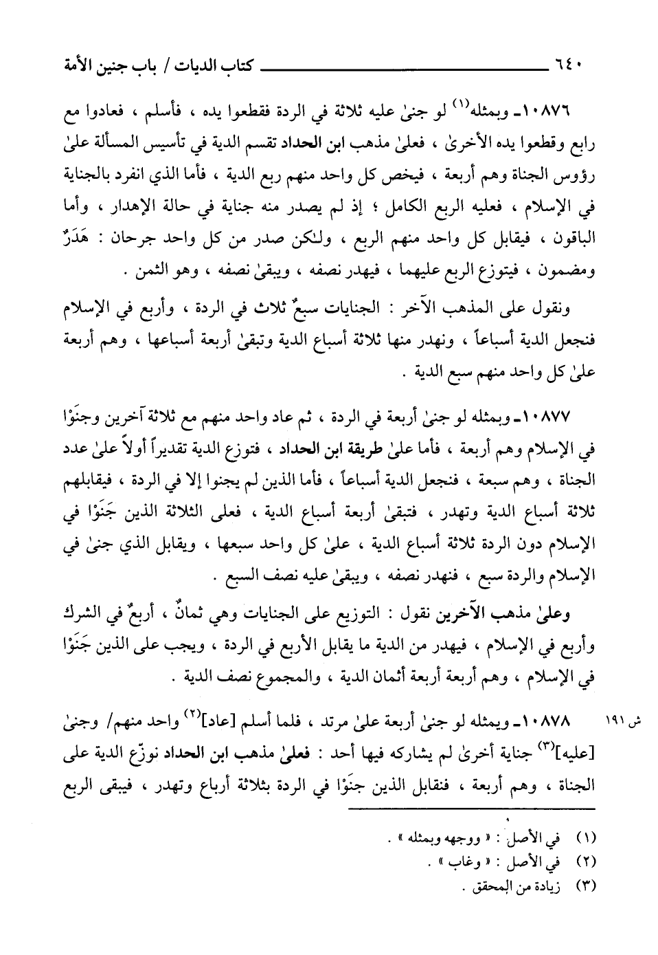 10878 - ويمثله لو جنى أربعة على مرتد، فلما أسلم [عاد] (2) واحد منهم وجنى [عليه] (3) جناية أخرى لم يشاركه فيها أحد: فعلى مذهب ابن الحداد نوزّع الدية على الجناة، وهم أربعة، فنقابل الذين جنَوْا في الردة بثلاثة أرباع وتهدر، فيبقى الربع