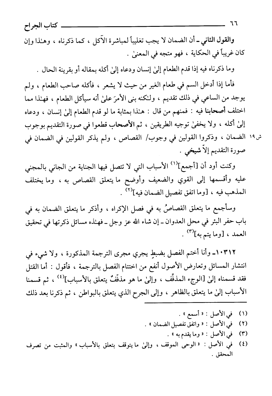 10312 - وأنا أختم الفصل بضبطٍ يجري مجرى الترجمة المذكورة، ولا شيء في انتشار المسائل وتعارض الأصول أنفع من اختتام الفصل بالترجمة، فأقول: أما القتل فقد قسمناه إلى [الوجء المذفِّف، وإلى ما هو مذفّفٌ يتعلق بالأسباب] (4)، ثم قسمنا الأسباب إلى ما يتعلق بالظاهر، وإلى الجرح الذي يتعلق بالبواطن، ثم ذكرنا بعد ذلك