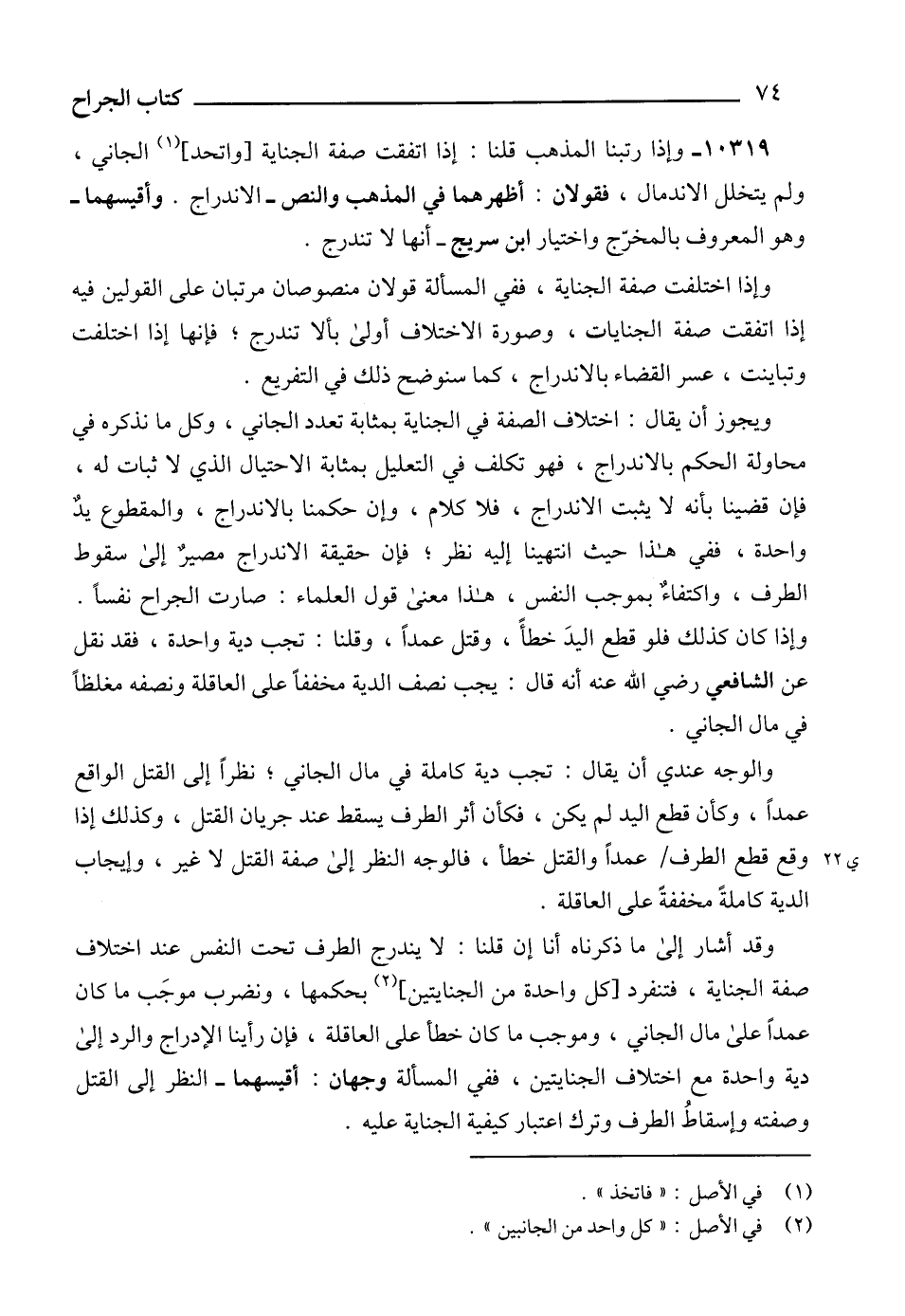 10319 - وإذا رتبنا المذهب قلنا: إذا اتفقت صفة الجناية [واتحد] (1) الجاني، ولم يتخلل الاندمال، فقولان: أظهرهما في المذهب والنص -الاندراج. وأقيسهما- وهو المعروف بالمخرّج واختيار ابن سريج- أنها لا تندرج.