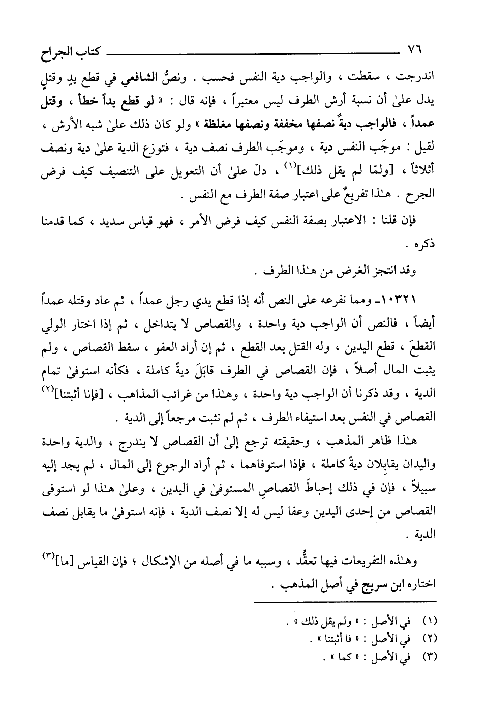 10321 - ومما نفرعه على النص أنه إذا قطع يدي رجل عمداً، ثم عاد وقتله عمداً أيضاًً، فالنص أن الواجب دية واحدة، والقصاص لا يتداخل، ثم إذا اختار الولي القطعَ، قطع اليدين، وله القتل بعد القطع، ثم إن أراد العفو، سقط القصاص، ولم يثبت المال أصلاً، فإن القصاص في الطرف قابَلَ ديةً كاملة، فكأنه استوفى تمام الدية، وقد ذكرنا أن الواجب دية واحدة، وهذا من غرائب المذاهب، [فإنا أثبتنا] (2) القصاص في النفس بعد استيفاء الطرف، ثم لم نثبت مرجعاً إلى الدية.