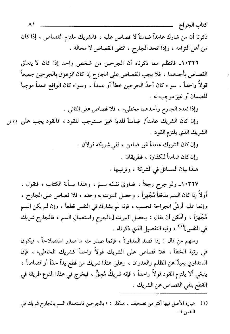 10326 - فانتظم مما ذكرناه أن الجرحين من شخص واحد إذا كان لا يتعلق القصاص بأحدهما، فلا يجب القصاص على الجارح إذا كان الزهوق بالجرحين جميعاً قولاً واحداً، سواء كان أحدُ الجرحين خطأ أو عمداً، وسواء كان الواقع عمداً موجِباً للضمان أو غيرَ موجِب له.