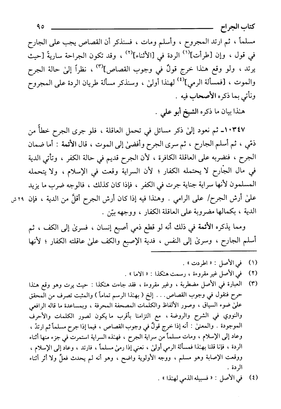 (3) العبارة في الأصل مضطربة، وغير مقروءة، فقد جاءت هكذا: حيث يرت وهو وقع هذا حرح فنقول في وجوب القصاص ... إلخ (بهذا الرسم تماماًً) والمثبت تصرف من المحقق على ضوء السياق، وصور الألفاظ والكلمات المصحفة المحرفة، وبمساعدة ما قاله الرافعي والنووي في الشرح والروضة، مع التزامنا بأقرب ما يكون لصور الكلمات والأحرف الموجودة. والمعنى: أنه إذا خرج قولٌ في وجوب القصاص، فيما إذا جرح مسلماً ثم ارتدّ، وعاد إلى الإسلام، ومات مسلماً من سراية الجرح، فهذه السراية استمرت في جزء منها أثناء الردة، فإنا قلنا بهذا فمسألة الرمي أولى، نعني إذا رمى مسلماً، فارتد، وعاد إلى الإسلام، ووقعت الإصابة وهو مسلم، ووجه الأولوية واضح، وهو أنه لم يحدث فعلٌ ولا أثر أثناء الردة.