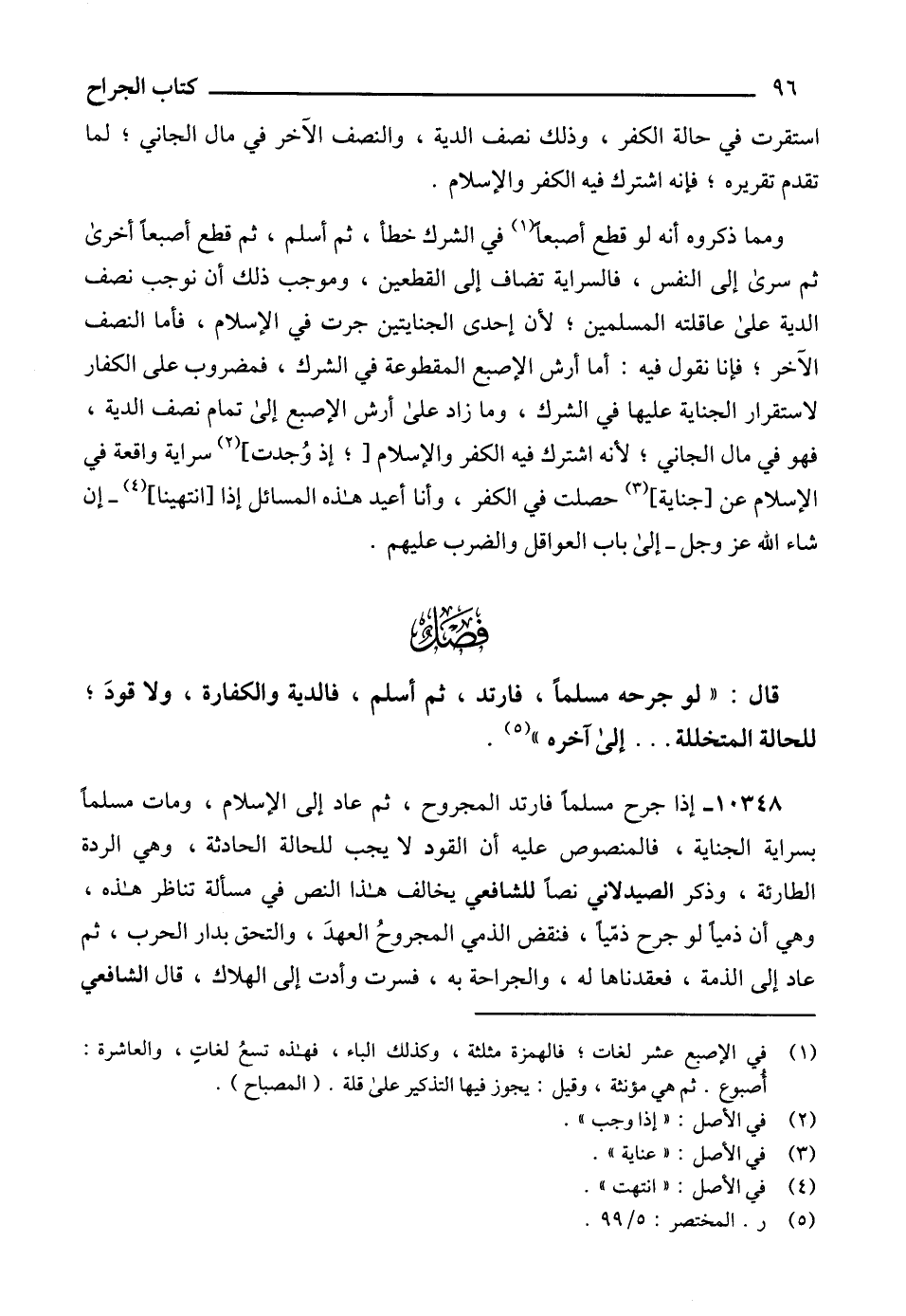10348 - إذا جرح مسلماً فارتد المجروح، ثم عاد إلى الإسلام، ومات مسلماً بسراية الجناية، فالمنصوص عليه أن القود لا يجب للحالة الحادثة، وهي الردة الطارئة، وذكر الصيدلاني نصاً للشافعي يخالف هذا النص في مسألة تناظر هذه، وهي أن ذمياً لو جرح ذمّياً، فنقض الذمي المجروحُ العهدَ، والتحق بدار الحرب، ثم عاد إلى الذمة، فعقدناها له، والجراحة به، فسرت وأدت إلى الهلاك، قال الشافعي