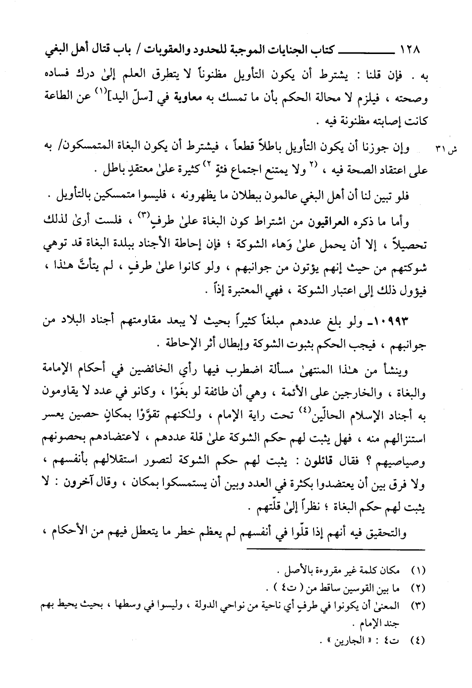 وينشأ من هذا المنتهى مسألة اضطرب فيها رأي الخائضين في أحكام الإمامة والبغاة، والخارجين على الأئمة، وهي أن طائفة لو بغَوْا، وكانو في عدد لا يقاومون به أجناد الإسلام الحالّين (4) تحت راية الإمام، ولكنهم تقوَّوْا بمكانٍ حصين يعسر استنزالهم منه، فهل يثبت لهم حكم الشوكة على قلة عددهم، لاعتضادهم بحصونهم وصياصيهم؟ فقال قائلون: يثبت لهم حكم الشوكة لتصور استقلالهم بأنفسهم، ولا فرق بين أن يعتضدوا بكثرة في العدد وبين أن يستمسكوا بمكان، وقال آخرون: لا يثبت لهم حكم البغاة؛ نظراً إلى قلّتهم.