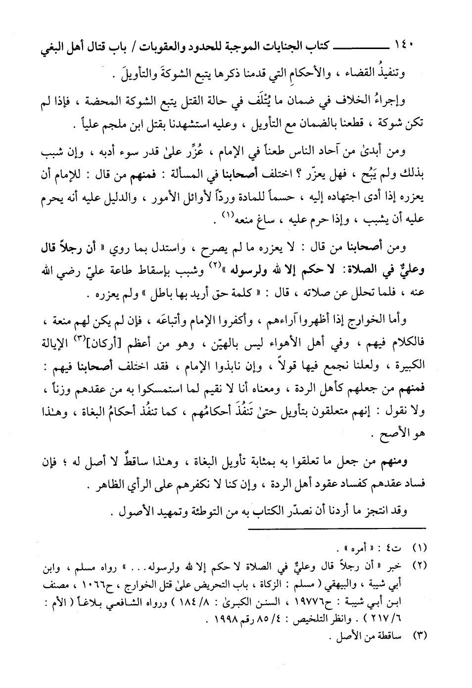 (2) خبر " أن رجلاً قال وعليٌّ في الصلاة لا حكم إلا لله ولرسوله ... " رواه مسلم، وابن أبي شيبة، والبيهقي (مسلم: الزكاة، باب التحريض على قتل الخوارج، ح1066، مصنف ابن أبي شيبة: ح19776، السنن الكبرى: 8/ 184) ورواه الشافعي بلاغاً (الأم: 6/ 217). وانظر التلخيص: 4/ 85 رقم 1998.