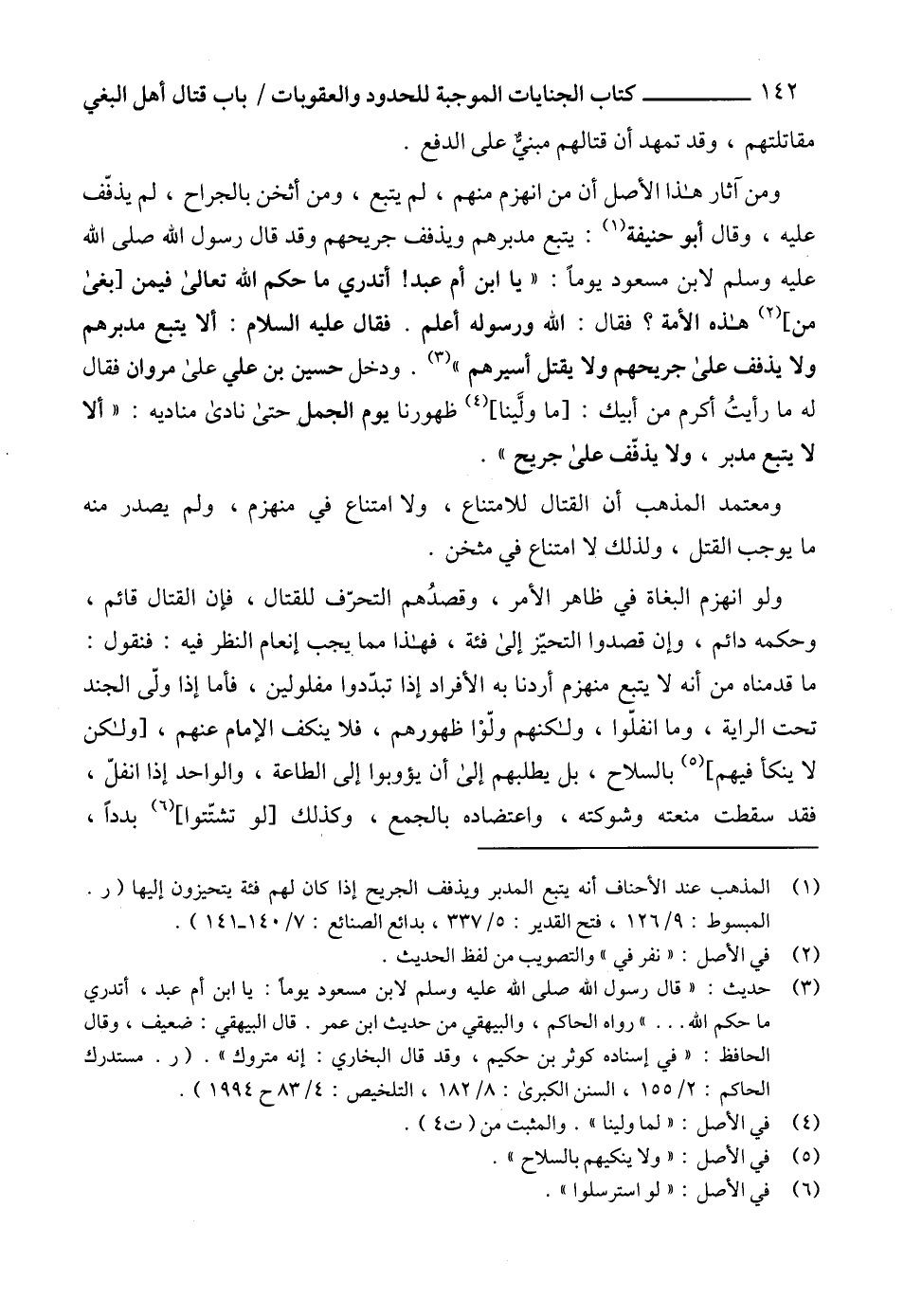 ومن آثار هذا الأصل أن من انهزم منهم، لم يتبع، ومن أثخن بالجراح، لم يذفّف عليه، وقال أبو حنيفة (1): يتبع مدبرهم ويذفف جريحهم وقد قال رسول الله صلى الله عليه وسلم لابن مسعود يوماً: " يا ابن أم عبد! أتدري ما حكم الله تعالى فيمن [بغى من] (2) هذه الأمة؟ فقال: الله ورسوله أعلم. فقال عليه السلام: ألا يتبع مدبرهم ولا يذفف على جريحهم ولا يقتل أسيرهم " (3). ودخل حسين بن علي على مروان فقال له ما رأيتُ أكرم من أبيك: [ما ولَّينا] (4) ظهورنا يوم الجمل حتى نادى مناديه: " ألا لا يتبع مدبر، ولا يذفّف على جريح ".