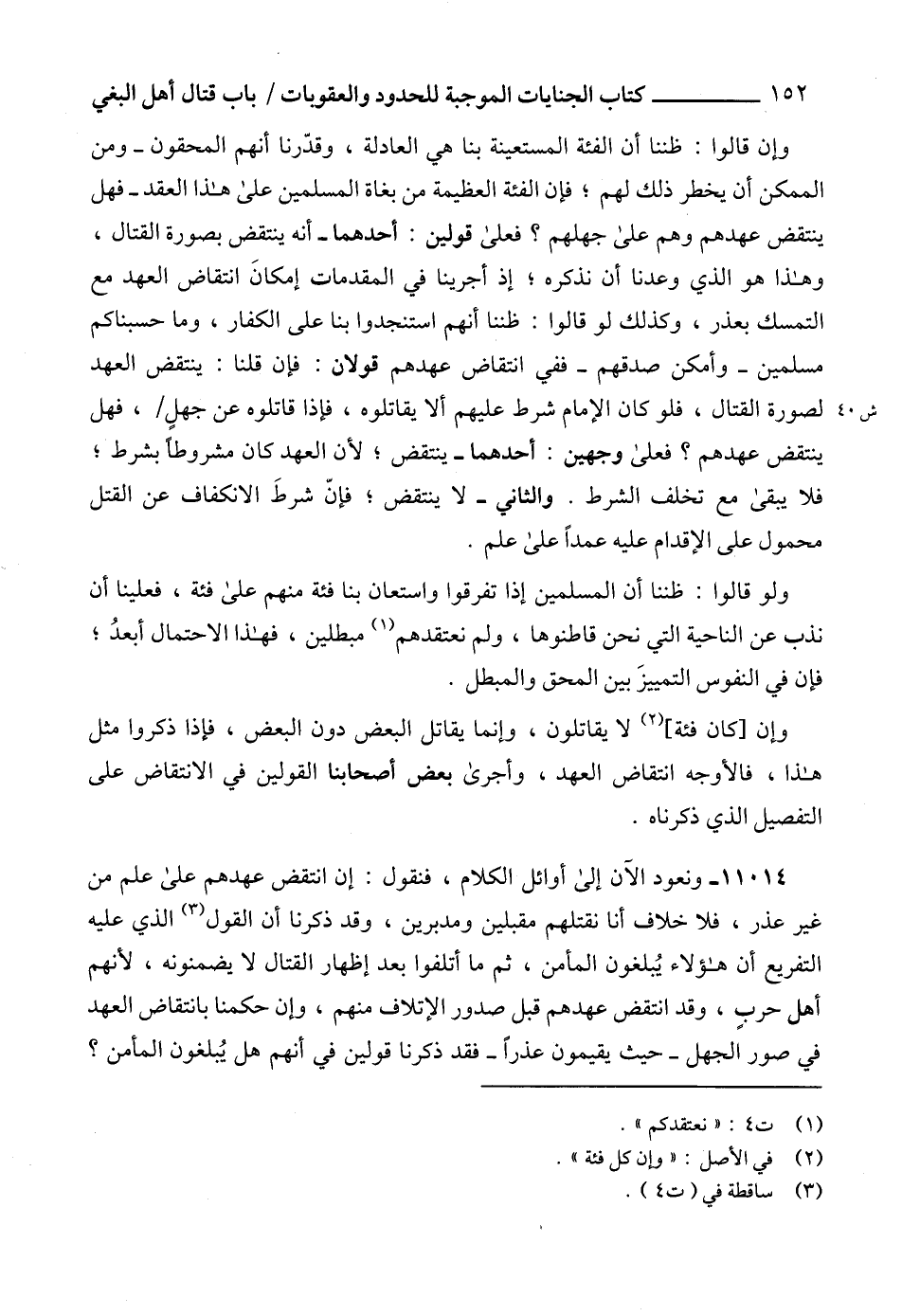 وإن قالوا: ظننا أن الفئة المستعينة بنا هي العادلة، وقدّرنا أنهم المحقون -ومن الممكن أن يخطر ذلك لهم؛ فإن الفئة العظيمة من بغاة المسلمين على هذا العقد- فهل ينتقض عهدهم وهم على جهلهم؟ فعلى قولين: أحدهما - أنه ينتقض بصورة القتال، وهذا هو الذي وعدنا أن نذكره؛ إذ أجرينا في المقدمات إمكانَ انتقاض العهد مع التمسك بعذر، وكذلك لو قالوا: ظننا أنهم استنجدوا بنا على الكفار، وما حسبناكم مسلمين -وأمكن صدقهم- ففي انتقاض عهدهم قولان: فإن قلنا: ينتقض العهد لصورة القتال، فلو كان الإمام شرط عليهم ألا يقاتلوه، فإذا قاتلوه عن جهلٍ، فهل ينتقض عهدهم؟ فعلى وجهين: أحدهما - ينتقض؛ لأن العهد كان مشروطاً بشرط؛ فلا يبقى مع تخلف الشرط. والثاني - لا ينتقض؛ فإنّ شرطَ الانكفاف عن القتل محمول على الإقدام عليه عمداً على علم.