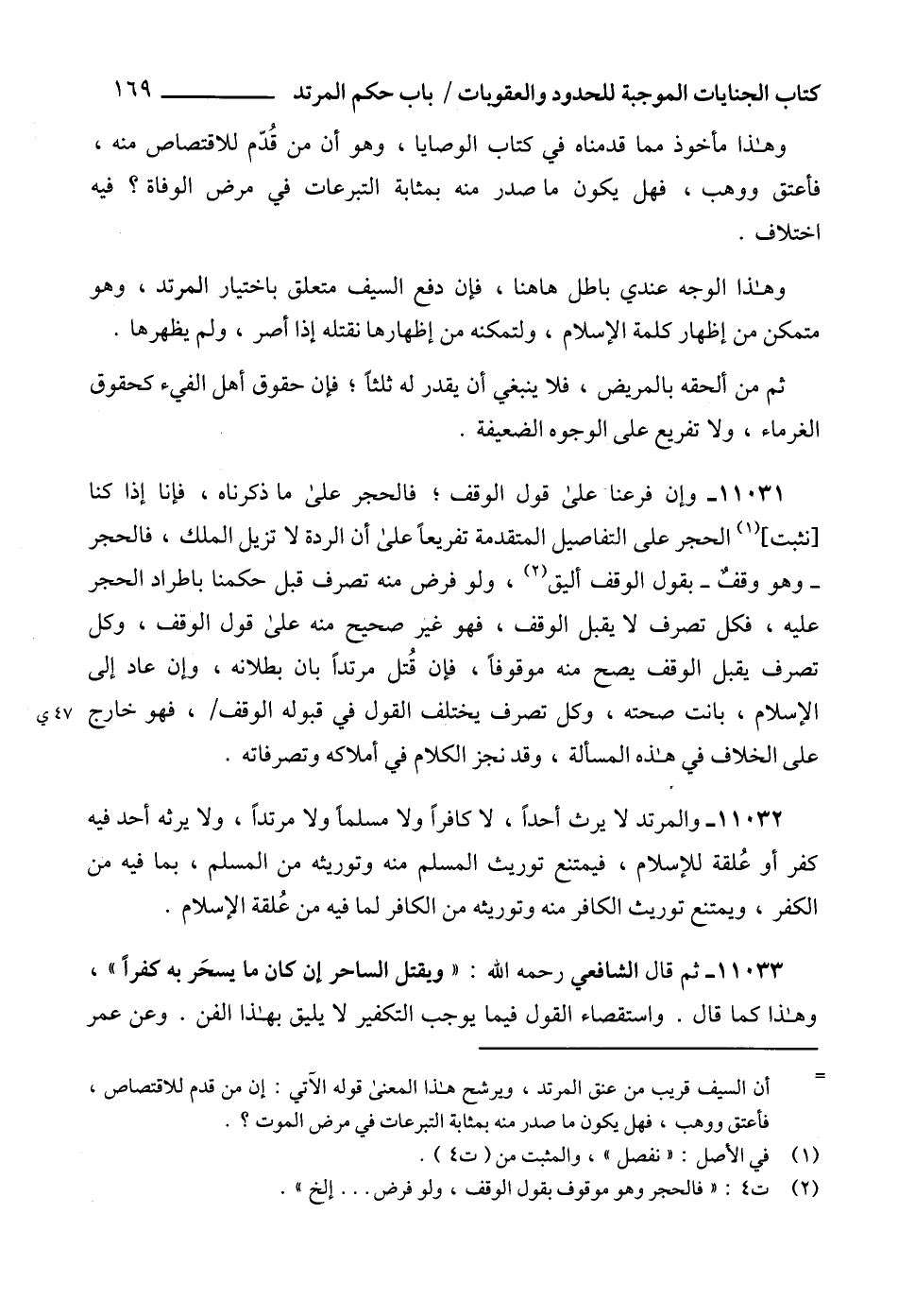 11032 - والمرتد لا يرث أحداً، لا كافراً ولا مسلماً ولا مرتداً، ولا يرثه أحد فيه كفر أو عُلقة للإسلام، فيمتنع توريث المسلم منه وتوريثه من المسلم، بما فيه من الكفر، ويمتنع توريث الكافر منه وتوريثه من الكافر لما فيه من عُلقة الإسلام.