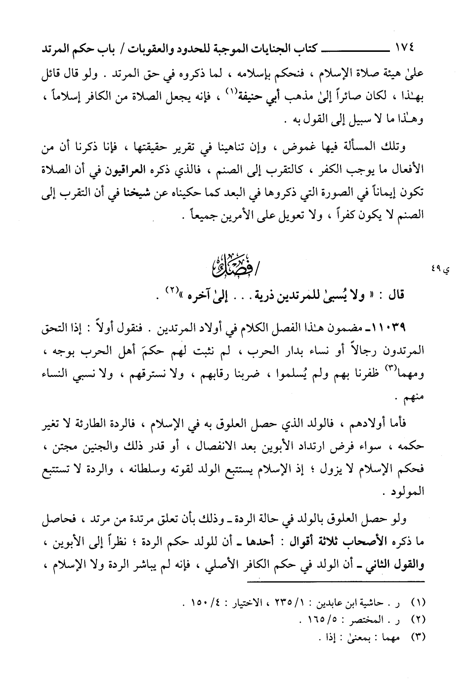 11039 - مضمون هذا الفصل الكلام في أولاد المرتدين. فنقول أولاً: إذا التحق المرتدون رجالاً أو نساء بدار الحرب، لم نثبت لهم حكمَ أهل الحرب بوجه، ومهما (3) ظفرنا بهم ولم يُسلموا، ضربنا رقابهم، ولا نسترقهم، ولا نسبي النساء منهم.