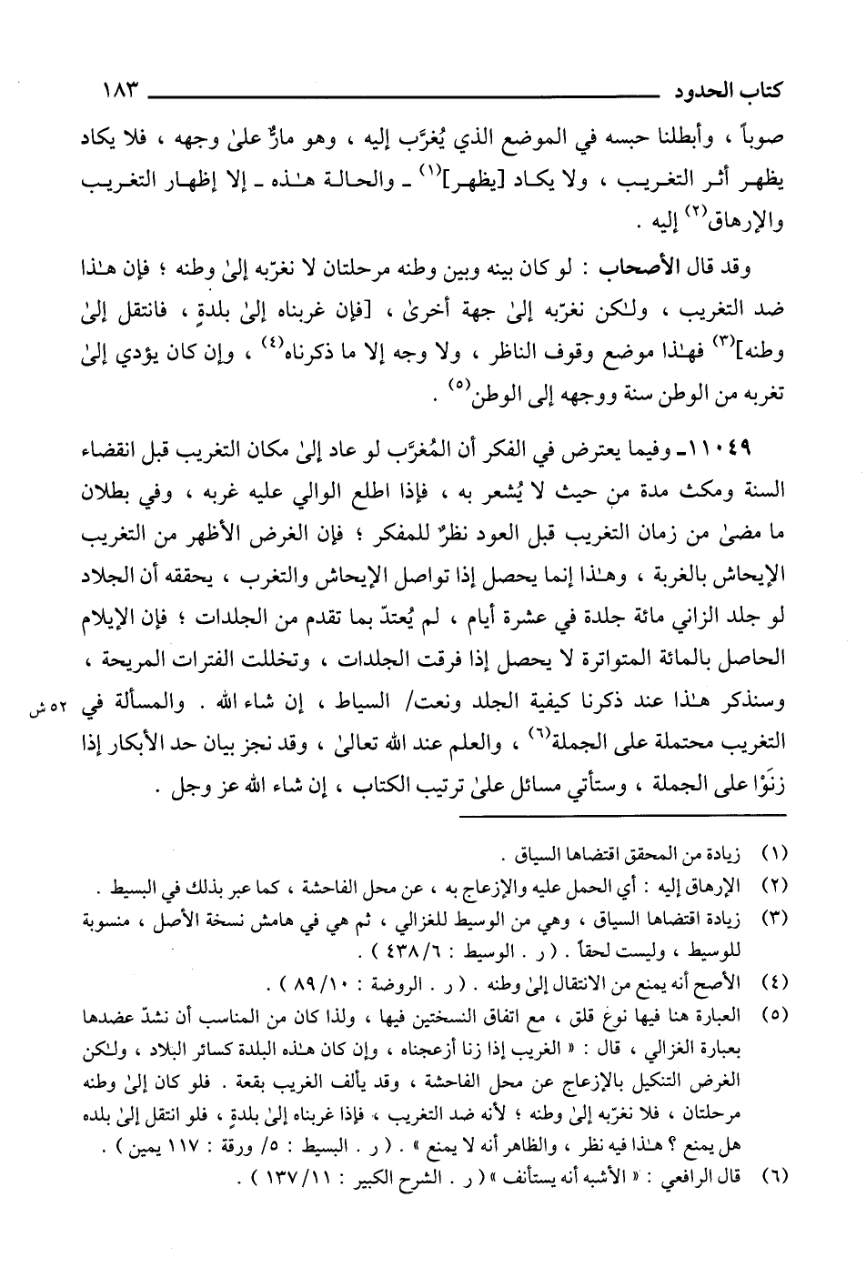 (5) العبارة هنا فيها نوع قلق، مع اتفاق النسختين فيها، ولذا كان من المناسب أن نشدّ عضدها بعبارة الغزالي، قال: " الغريب إذا زنا أزعجناه، وإن كان هذه البلدة كسائر البلاد، ولكن الغرض التنكيل بالإزعاج عن محل الفاحشة، وقد يألف الغريب بقعة. فلو كان إلى وطنه مرحلتان، فلا نغرّبه إلى وطنه؛ لأنه ضد التغريب، فإذا غربناه إلى بلدةٍ، فلو انتقل إلى بلده هل يمنع؟ هذا فيه نظر، والظاهر أنه لا يمنع ". (ر. البسيط: 5/ورقة: 117 يمين).