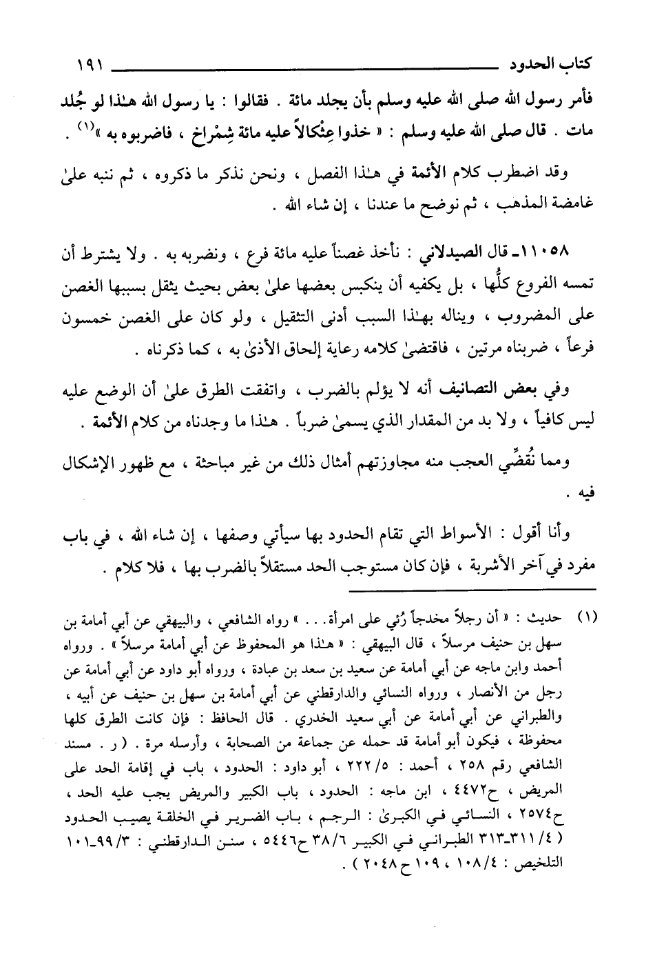(1) حديث: " أن رجلاً مخدجاً رُئي على امرأة ... " رواه الشافعي، والبيهقي عن أبي أمامة بن سهل بن حنيف مرسلاً، قال البيهقي: " هذا هو المحفوظ عن أبي أمامة مرسلاً ". ورواه أحمد وابن ماجه عن أبي أمامة عن سعيد بن سعد بن عبادة، ورواه أبو داود عن أبي أمامة عن رجل من الأنصار، ورواه النسائي والدارقطني عن أبي أمامة بن سهل بن حنيف عن أبيه، والطبراني عن أبي أمامة عن أبي سعيد الخدري. قال الحافظ: فإن كانت الطرق كلها محفوظة، فيكون أبو أمامة قد حمله عن جماعة من الصحابة، وأرسله مرة. (ر. مسند الشافعي رقم 258، أحمد: 5/ 222، أبو داود: الحدود، باب في إقامة الحد على المريض، ح 4472، ابن ماجه: الحدود، باب الكبير والمريض يجب عليه الحد، ح 2574، النسائي في الكبرى: الرجم، باب الضرير في الخلقة يصيب الحدود (4/ 311 - 313 الطبراني في الكبير 6/ 38 ح 5446، سنن الدارقطني: 3/ 99 - 101 التلخيص: 4/ 108، 109 ح 2048).