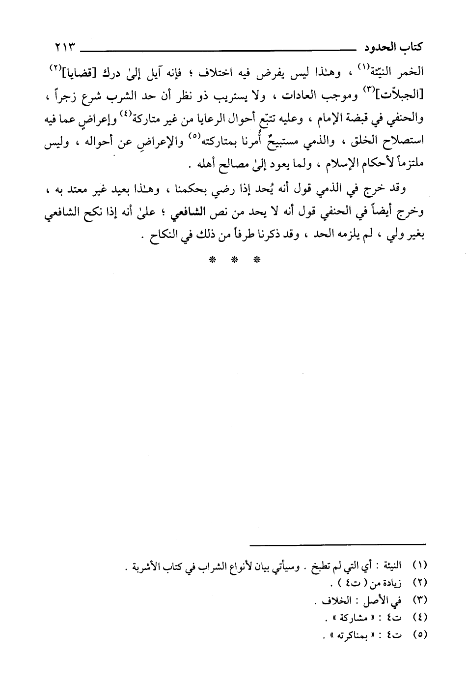 الخمر النيّئة (1)، وهذا ليس يفرض فيه اختلاف؛ فإنه آيل إلى درك [قضايا] (2) [الجبلاّت] (3) وموجب العادات، ولا يستريب ذو نظر أن حد الشرب شرع زجراً، والحنفي في قبضة الإمام، وعليه تتبّع أحوال الرعايا من غير متاركة (4) وإعراضٍ عما فيه استصلاح الخلق، والذمي مستبيحٌ أُمرنا بمتاركته (5) والإعراضِ عن أحواله، وليس ملتزماً لأحكام الإسلام، ولما يعود إلى مصالح أهله.