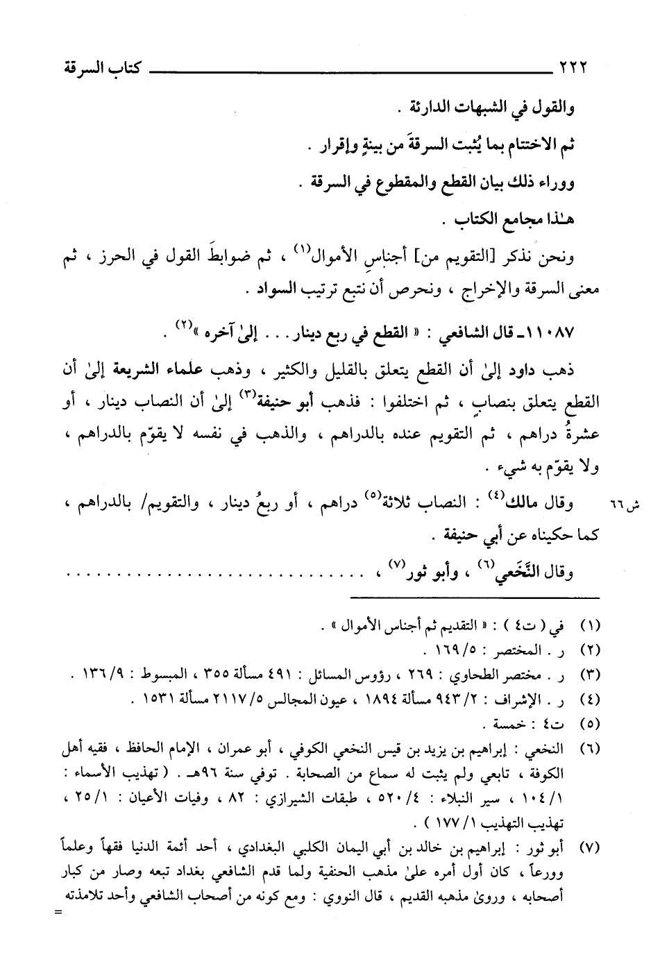 (6) النخعي: إبراهيم بن يزيد بن قيس النخعي الكوفي، أبو عمران، الإمام الحافظ، فقيه أهل الكوفة، تابعي ولم يثبت له سماع من الصحابة. توفي سنة 96هـ. (تهذيب الأسماء: 1/ 104، سير النبلاء: 4/ 520، طبقات الشيرازي: 82، وفيات الأعيان: 1/ 25، تهذيب التهذيب 1/ 177).