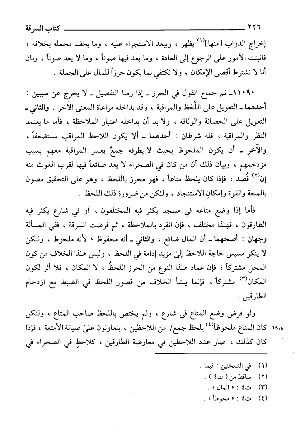 11090 - ثم جماع القول في الحرز -إذا رمنا التفصيل- لا يخرج عن سببين: أحدهما - التعويل على اللَّحْظ والمراقبة، وقد يداخله مراعاة المعنى الآخر. والثاني - التعويل على الحصانة والوثاقة، ولا بد أن يداخله اعتبار الملاحظة، فأما ما يعتمد النظر والمراقبة، فله شرطان: أحدهما - ألا يكون اللاحظ المراقب مستضعفاً، والآخر - أن يكون الملحوظ بحيث لايطرقه جمعٌ يعسر المراقبة معهم بسبب مزدحمهم، وبيان ذلك أن من كان في الصحراء لا يعد ضائعاً فيها لقرب الغوث منه إن (2) قُصد، فإذا كان يلحظ متاعاً، فهو محرز باللحظ، وهو على التحقيق مصون بالمنعة والقوة وإمكانِ الاستنجاد، ولكن من ضرورة ذلك اللحظ.