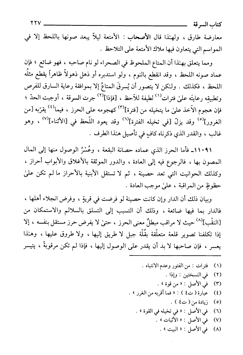 11091 - فأما الحرز الذي عماده حصانة البقعة، وعُسْرُ الوصول منها إلى المال المصون بها، فالرجوع فيه إلى العادة، والدور الموثقة بالأغلاق والأبواب أحراز، وكذلك الحوانيت التي تعد حصينة، ثم لا تستقل الأبنية بالأحراز ما لم تكن على حظوظٍ من المراقبة، على موجب العادة.
