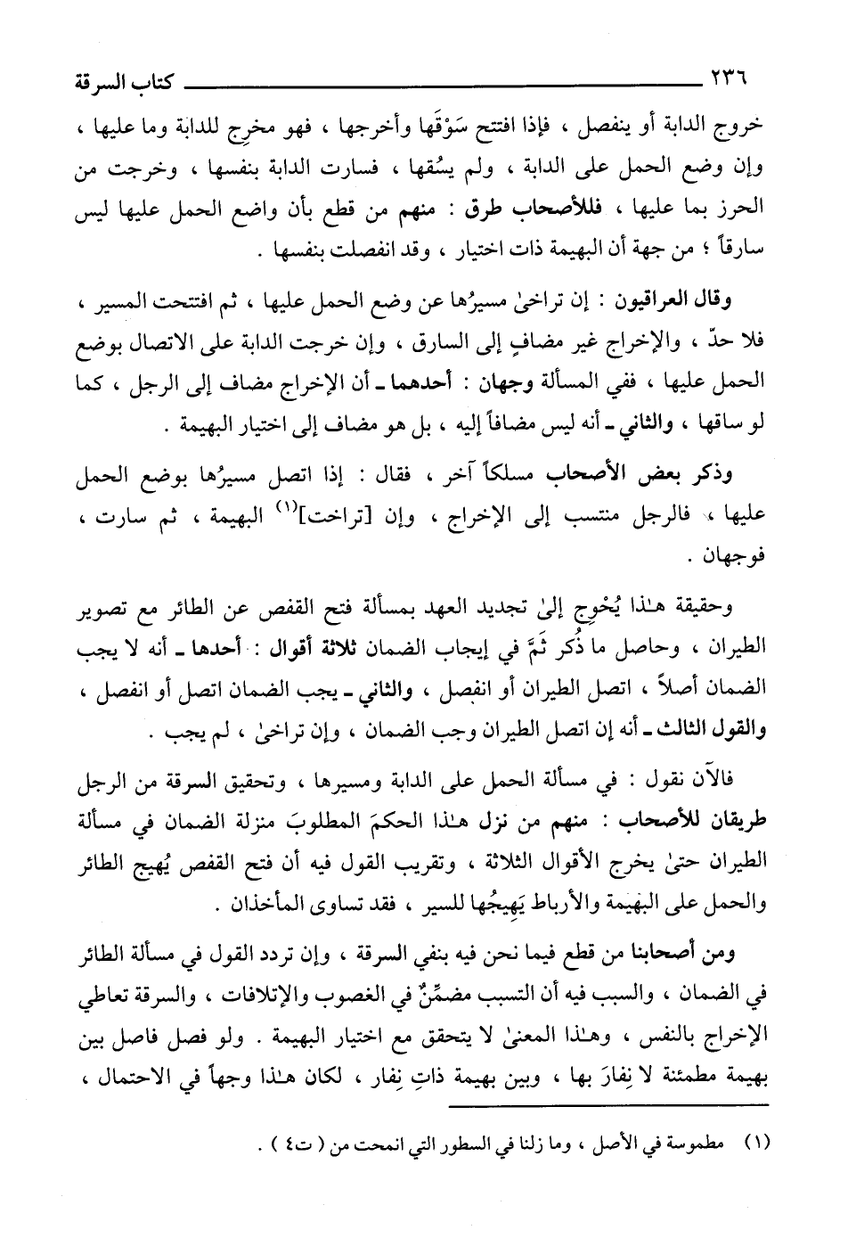 فالآن نقول: في مسألة الحمل على الدابة ومسيرها، وتحقيق السرقة من الرجل طريقان للأصحاب: منهم من نزل هذا الحكمَ المطلوبَ منزلة الضمان في مسألة الطيران حتى يخرج الأقوال الثلاثة، وتقريب القول فيه أن فتح القفص يُهيج الطائر والحمل على البهيمة والأرباط يَهِيجُها للسير، فقد تساوى المأخذان.