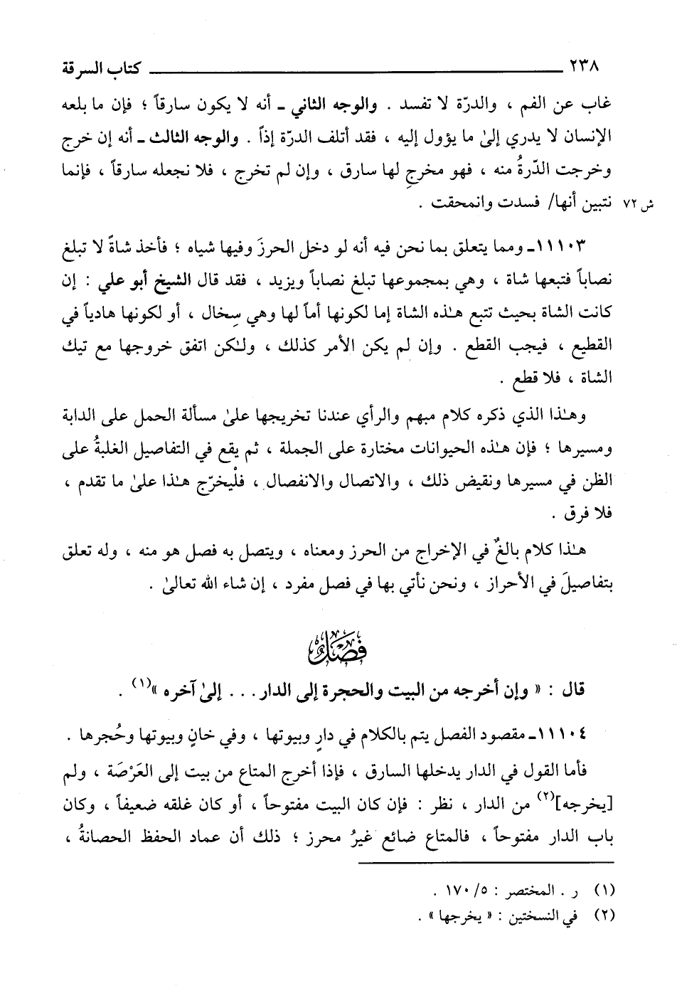 11104 - مقصود الفصل يتم بالكلام في دارٍ وبيوتها، وفي خانٍ وبيوتها وحُجرها.