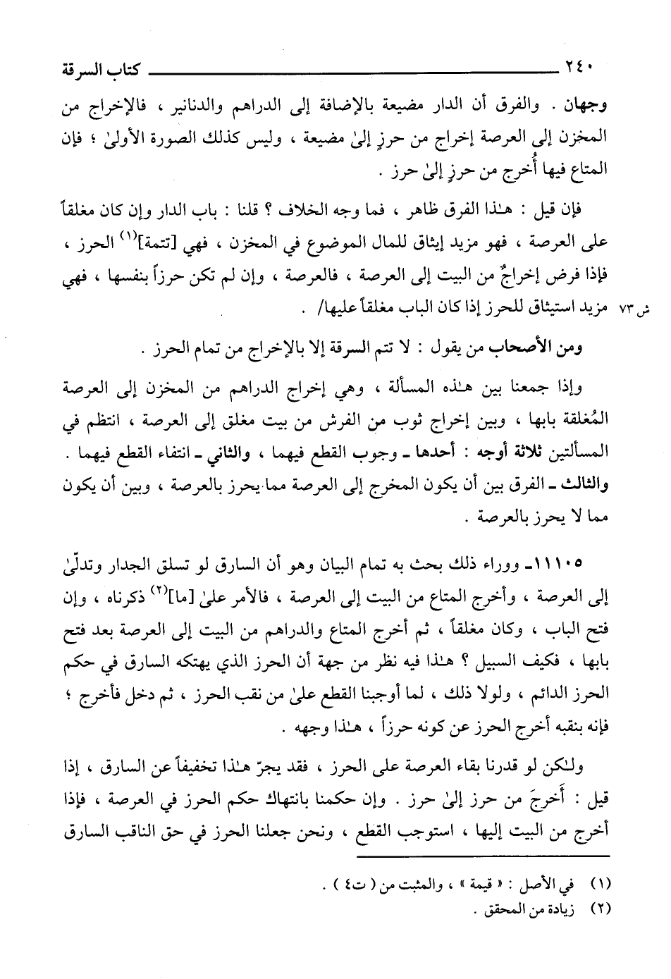 11105 - ووراء ذلك بحث به تمام البيان وهو أن السارق لو تسلق الجدار وتدلّى إلى العرصة، وأخرج المتاع من البيت إلى العرصة، فالأمر على [ما] (2) ذكرناه، وإن فتح الباب، وكان مغلقاً، ثم أخرج المتاع والدراهم من البيت إلى العرصة بعد فتح بابها، فكيف السبيل؟ هذا فيه نظر من جهة أن الحرز الذي يهتكه السارق في حكم الحرز الدائم، ولولا ذلك، لما أوجبنا القطع على من نقب الحرز، ثم دخل فأخرج؛ فإنه بنقبه أخرج الحرز عن كونه حرزاً، هذا وجهه.
