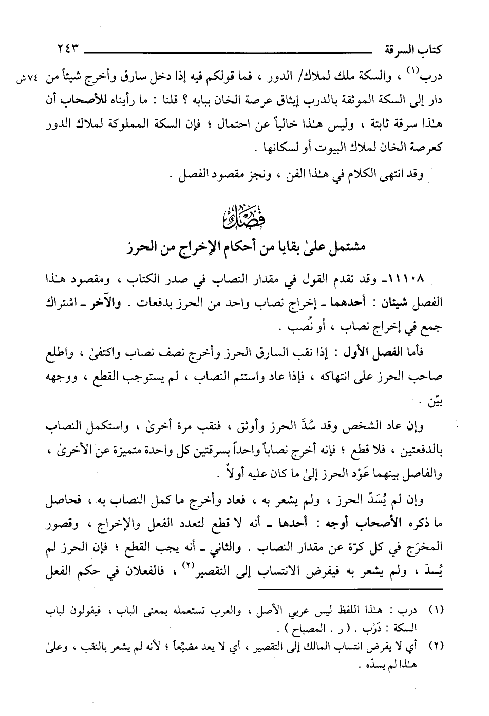11108 - وقد تقدم القول في مقدار النصاب في صدر الكتاب، ومقصود هذا الفصل شيئان: أحدهما - إخراج نصاب واحد من الحرز بدفعات. والآخر - اشتراك جمع في إخراج نصاب، أو نُصب.
