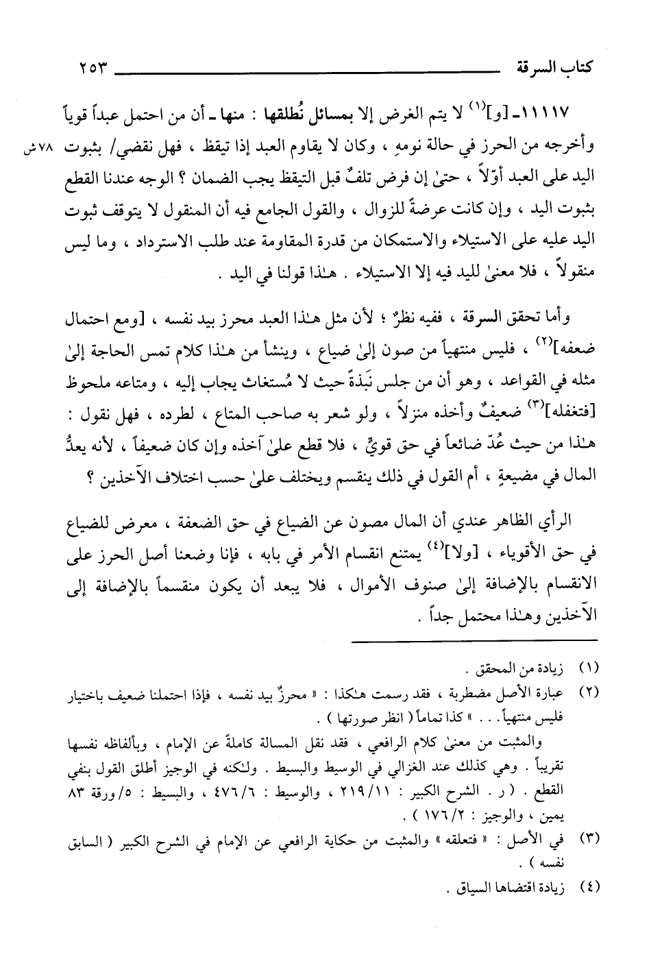 11117 - [و] (1) لا يتم الغرض إلا بمسائل نُطلقها: منها - أن من احتمل عبداً قوياً وأخرجه من الحرز في حالة نومهِ، وكان لا يقاوم العبد إذا تيقظ، فهل نقضي بثبوت اليد على العبد أوّلاً، حتى إن فرض تلفٌ قبل التيقظ يجب الضمان؟ الوجه عندنا القطع بثبوت اليد، وإن كانت عرضةً للزوال، والقول الجامع فيه أن المنقول لا يتوقف ثبوت اليد عليه على الاستيلاء والاستمكان من قدرة المقاومة عند طلب الاسترداد، وما ليس منقولاً، فلا معنى لليد فيه إلا الاستيلاء. هذا قولنا في اليد.