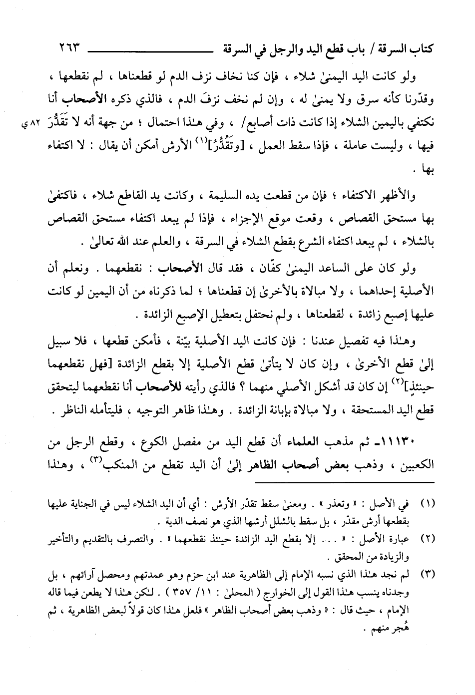 11130 - ثم مذهب العلماء أن قطع اليد من مفصل الكوع، وقطع الرجل من الكعبين، وذهب بعض أصحاب الظاهر إلى أن اليد تقطع من المنكب (3)، وهذا