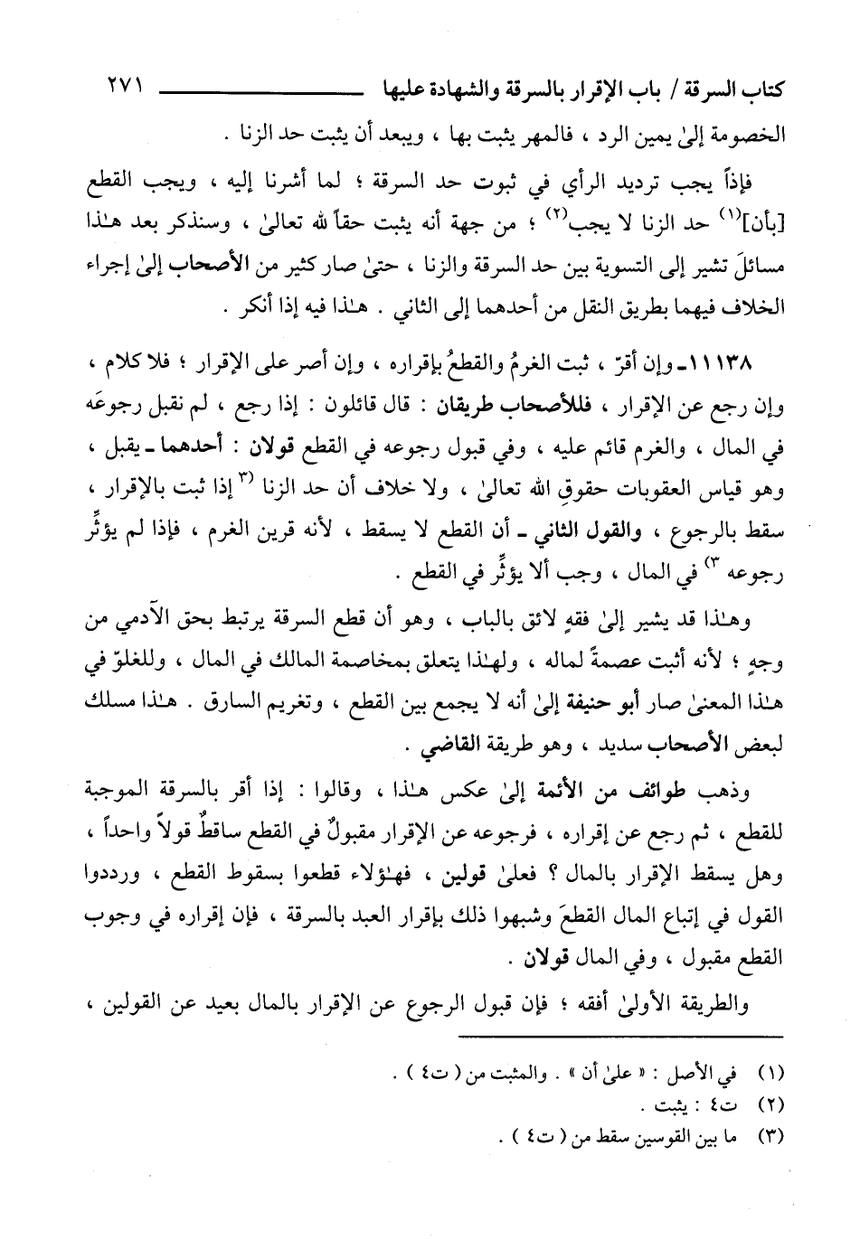 وذهب طوائف من الأئمة إلى عكس هذا، وقالوا: إذا أقر بالسرقة الموجبة للقطع، ثم رجع عن إقراره، فرجوعه عن الإقرار مقبولٌ في القطع ساقطٌ قولاً واحداً، وهل يسقط الإقرار بالمال؟ فعلى قولين، فهؤلاء قطعوا بسقوط القطع، ورددوا القول في إتباع المال القطعَ وشبهوا ذلك بإقرار العبد بالسرقة، فإن إقراره في وجوب القطع مقبول، وفي المال قولان.