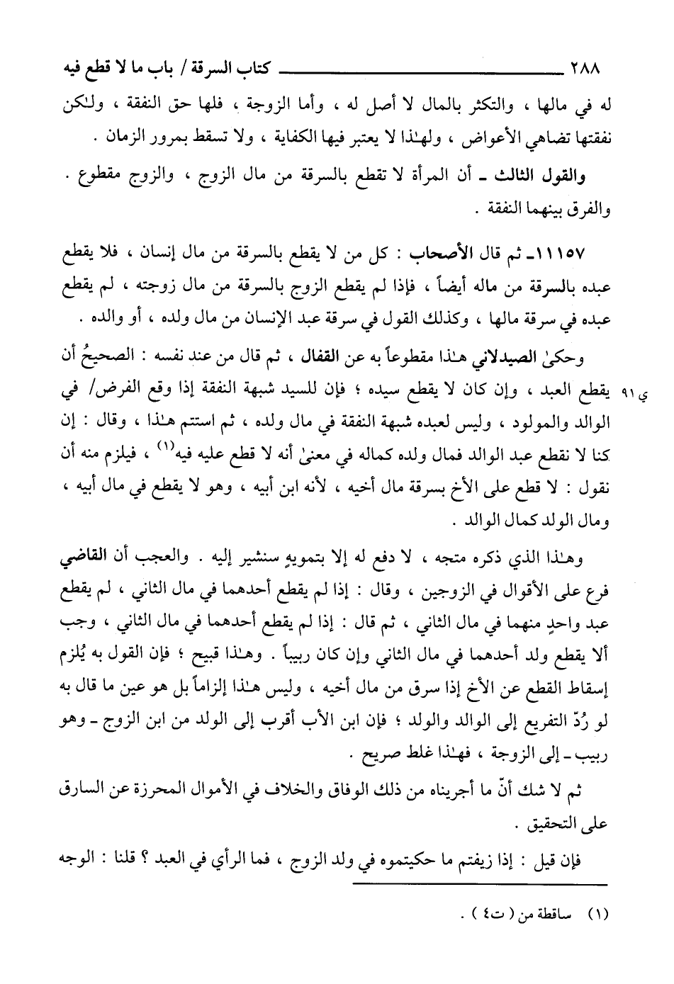 وهذا الذي ذكره متجه، لا دفع له إلا بتمويهٍ سنشير إليه. والعجب أن القاضي فرع على الأقوال في الزوجين، وقال: إذا لم يقطع أحدهما في مال الثاني، لم يقطع عبد واحدٍ منهما في مال الثاني، ثم قال: إذا لم يقطع أحدهما في مال الثاني، وجب ألا يقطع ولد أحدهما في مال الثاني وإن كان ربيباً. وهذا قبيح؛ فإن القول به يُلزم إسقاط القطع عن الأخ إذا سرق من مال أخيه، وليس هذا إلزاماً بل هو عين ما قال به لو رُدّ التفريع إلى الوالد والولد؛ فإن ابن الأب أقرب إلى الولد من ابن الزوج -وهو ربيب- إلى الزوجة، فهذا غلط صريح.