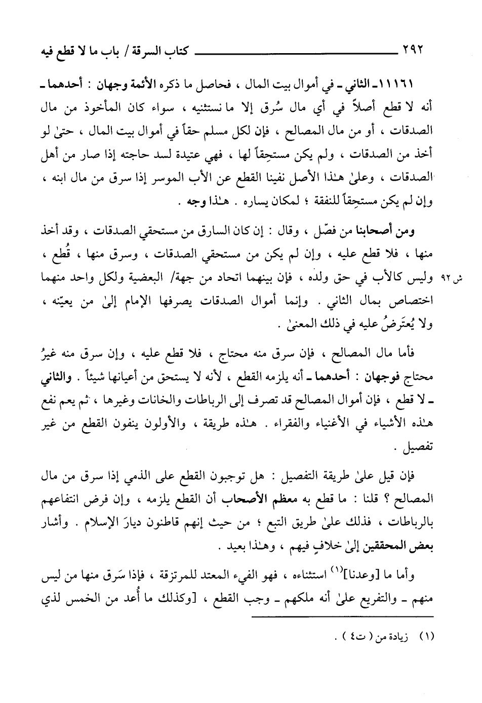 11161 - الثاني - في أموال بيت المال، فحاصل ما ذكره الأئمة وجهان: أحدهما - أنه لا قطع أصلاً في أي مال سُرق إلا ما نستثنيه، سواء كان المأخوذ من مال الصدقات، أو من مال المصالح، فإن لكل مسلم حقاً في أموال بيت المال، حتى لو أخذ من الصدقات، ولم يكن مستحِقاً لها، فهي عتيدة لسد حاجته إذا صار من أهل ْالصدقات، وعلى هذا الأصل نفينا القطع عن الأب الموسر إذا سرق من مال ابنه، وإن لم يكن مستحِقاً للنفقة؛ لمكان يساره. هذا وجه.