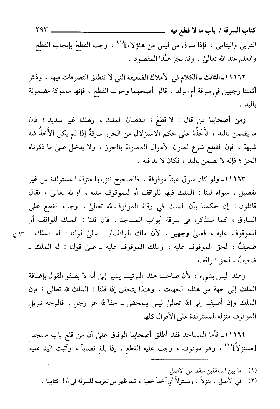 11162 - الثالث - الكلام في الأملاك الضعيفة التي لا تنطلق التصرفات فيها، وذكر أئمتنا وجهين في سرقة أم الولد، قالوا أصحهما وجوب القطع، فإنها مملوكة مضمونة باليد.