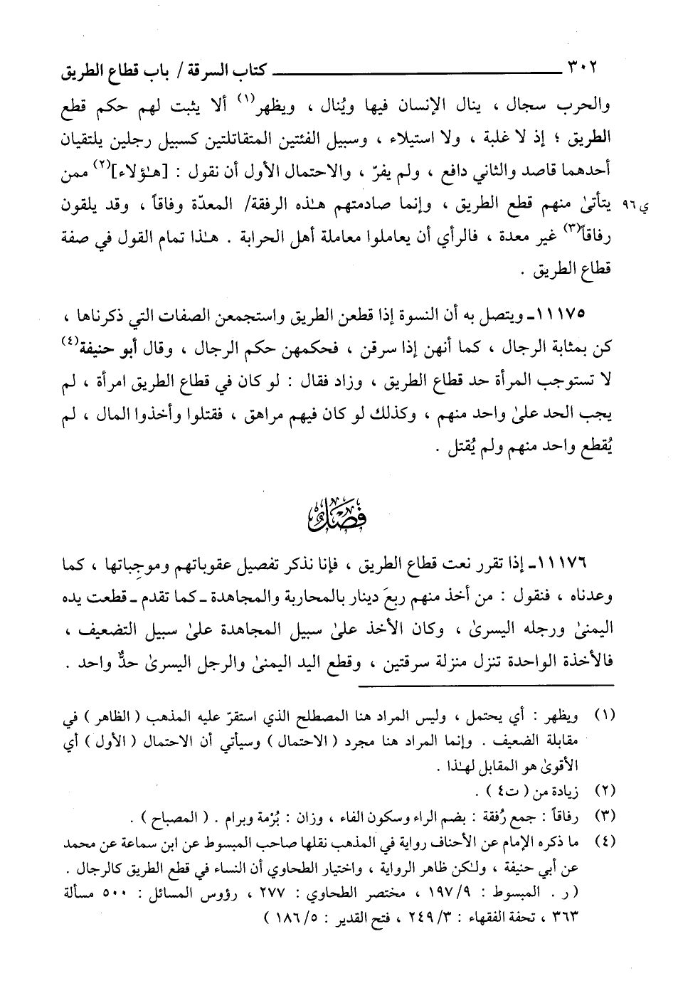 (4) ما ذكره الإمام عن الأحناف رواية في المذهب نقلها صاحب المبسوط عن ابن سماعة عن محمد عن أبي حنيفة، ولكن ظاهر الرواية، واختيار الطحاوي أن النساء في قطع الطريق كالرجال.